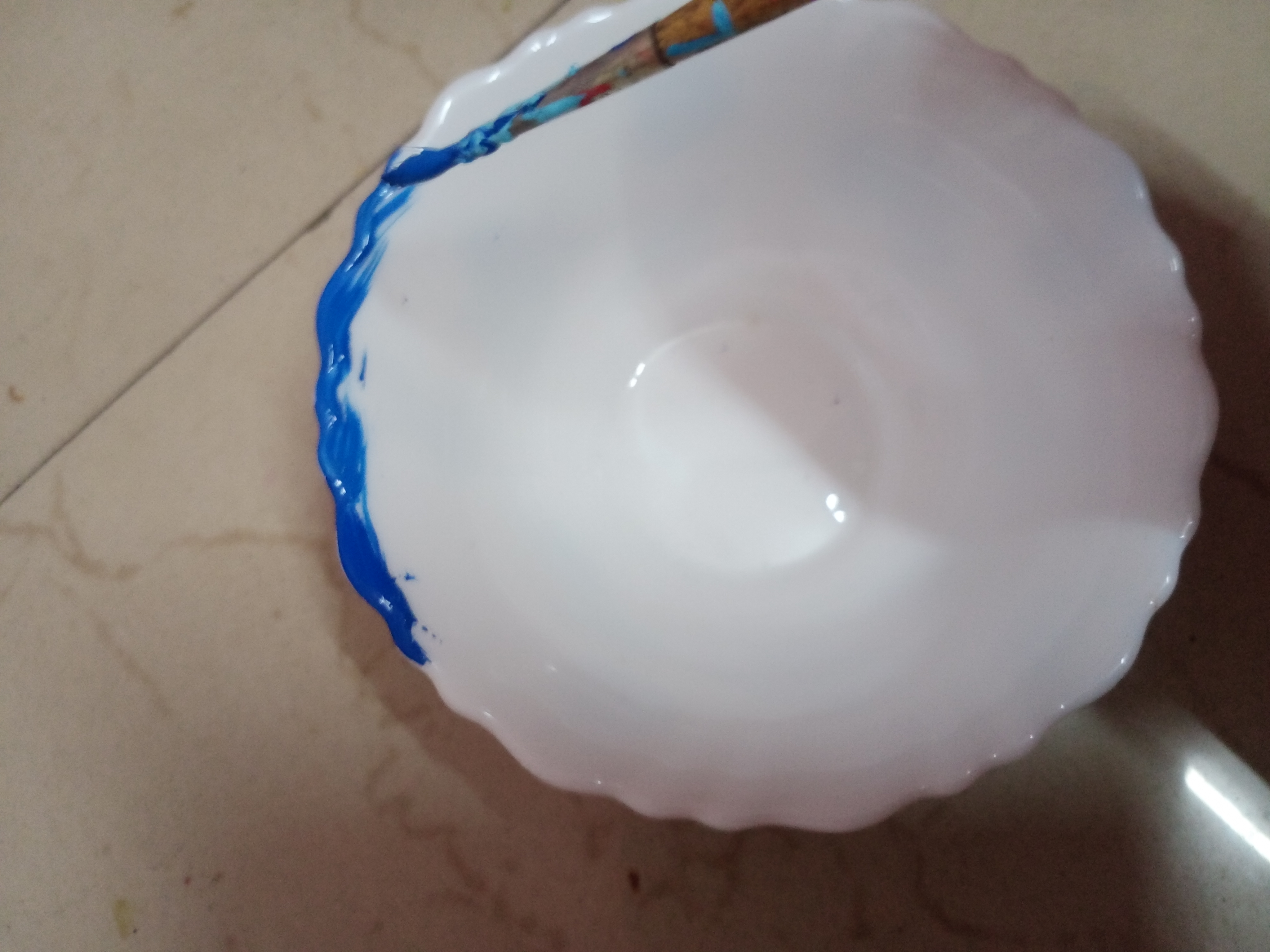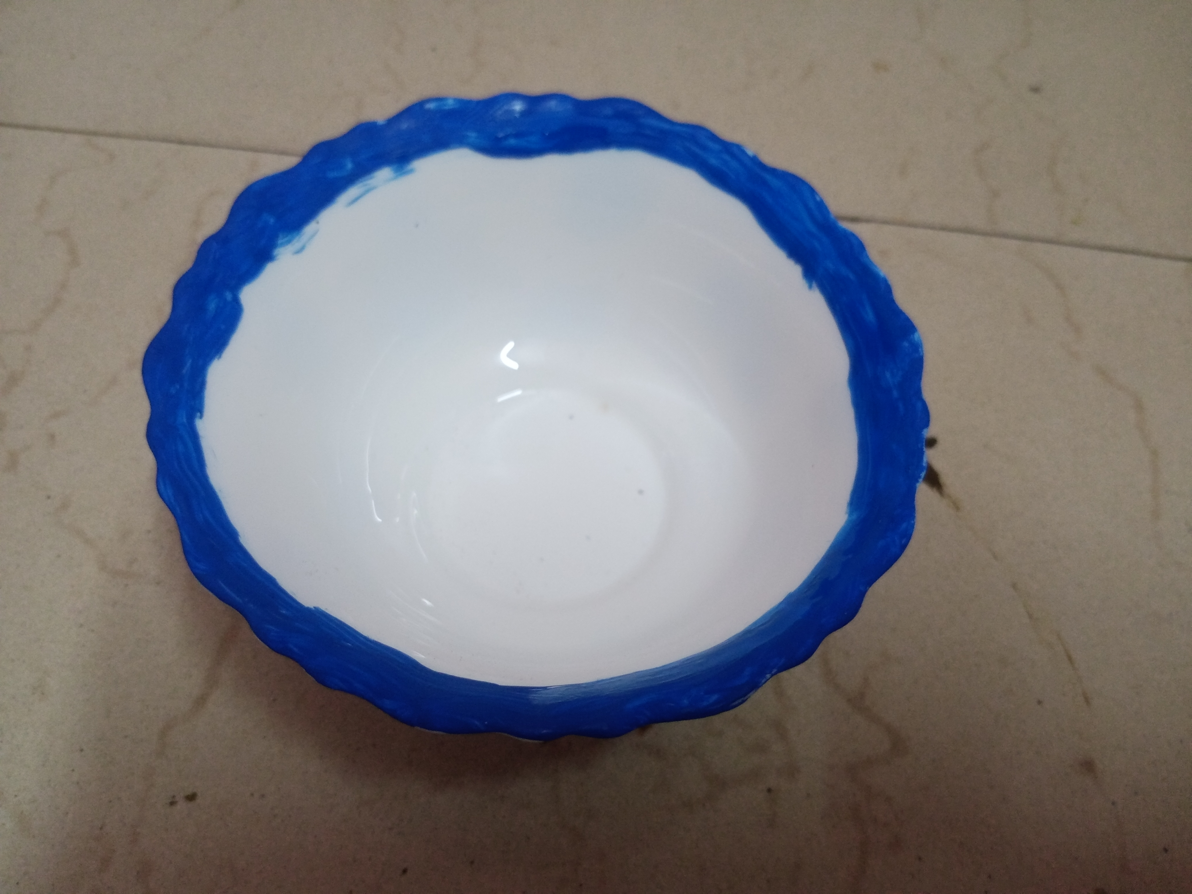 - Once the exterior was complete, I painted a blue band along the rim of the bowl's inner surface, followed by a layer of green paint.