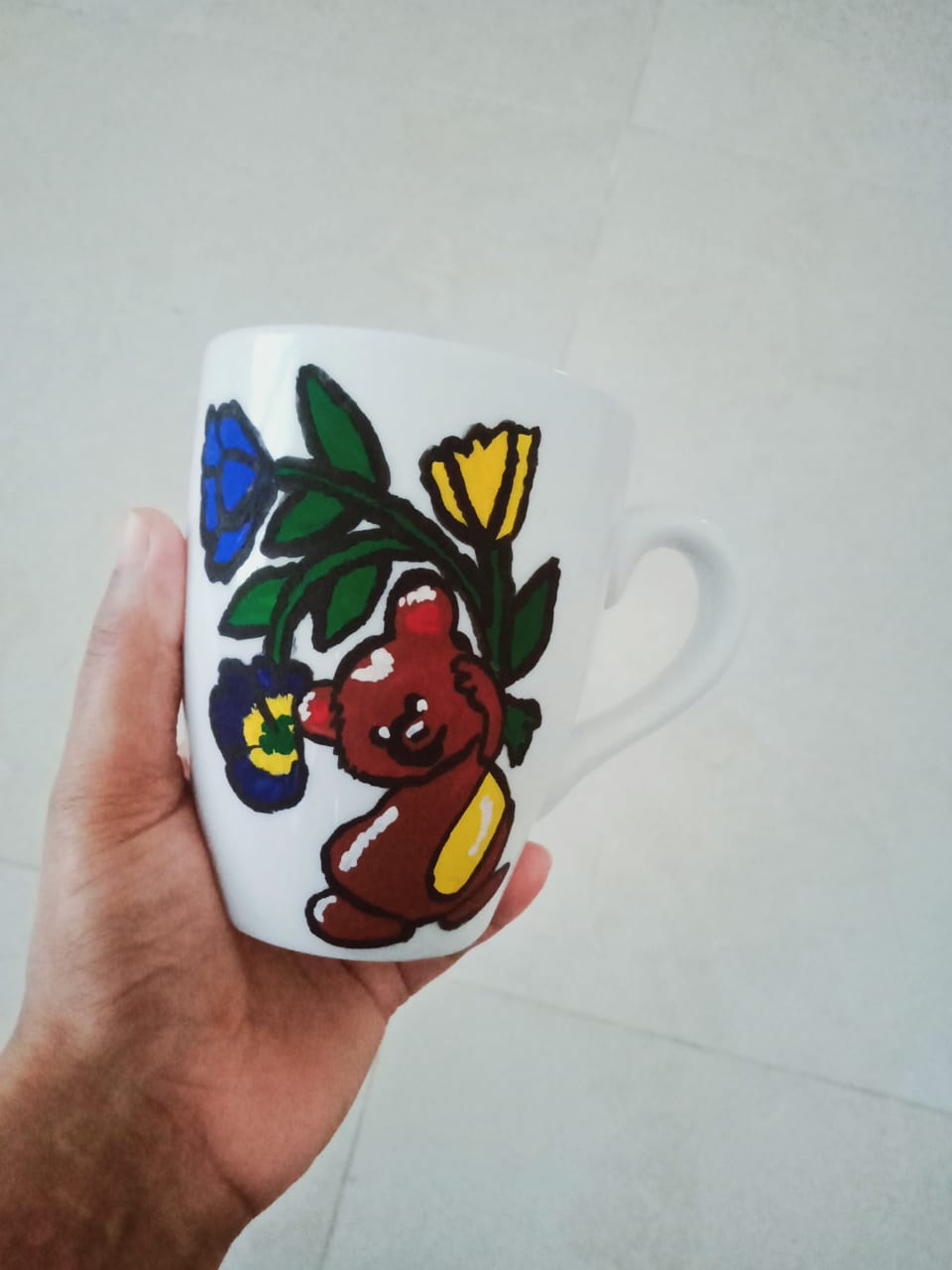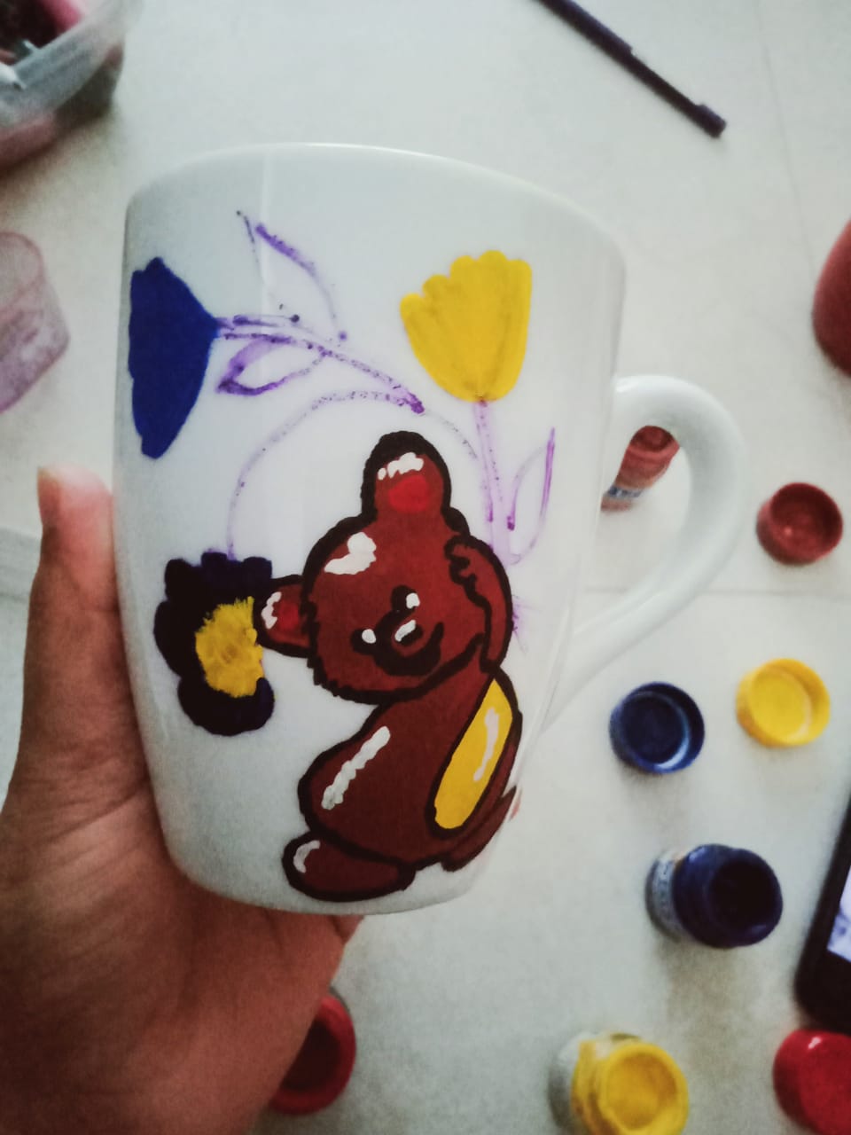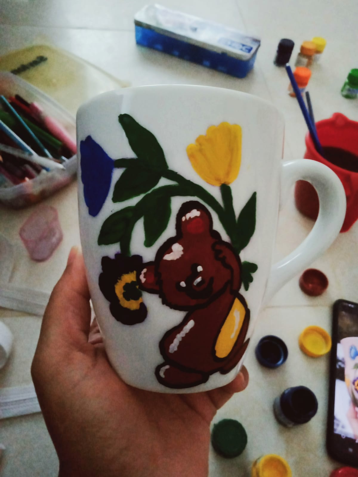 The painting that I did today is a picture of a teddy bear on a ceramic mug and a picture of flowers. I was inspired by this picture from Google and decided to paint this picture. So without further ado, let's come to the main discussion.