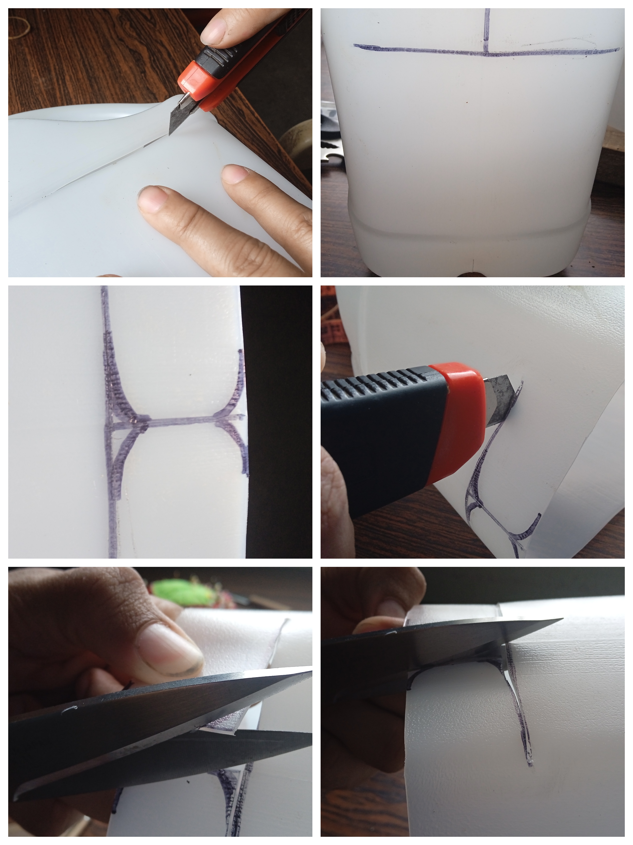Inicié cortando la parte superior del recipiente plástico. Separé el asa.