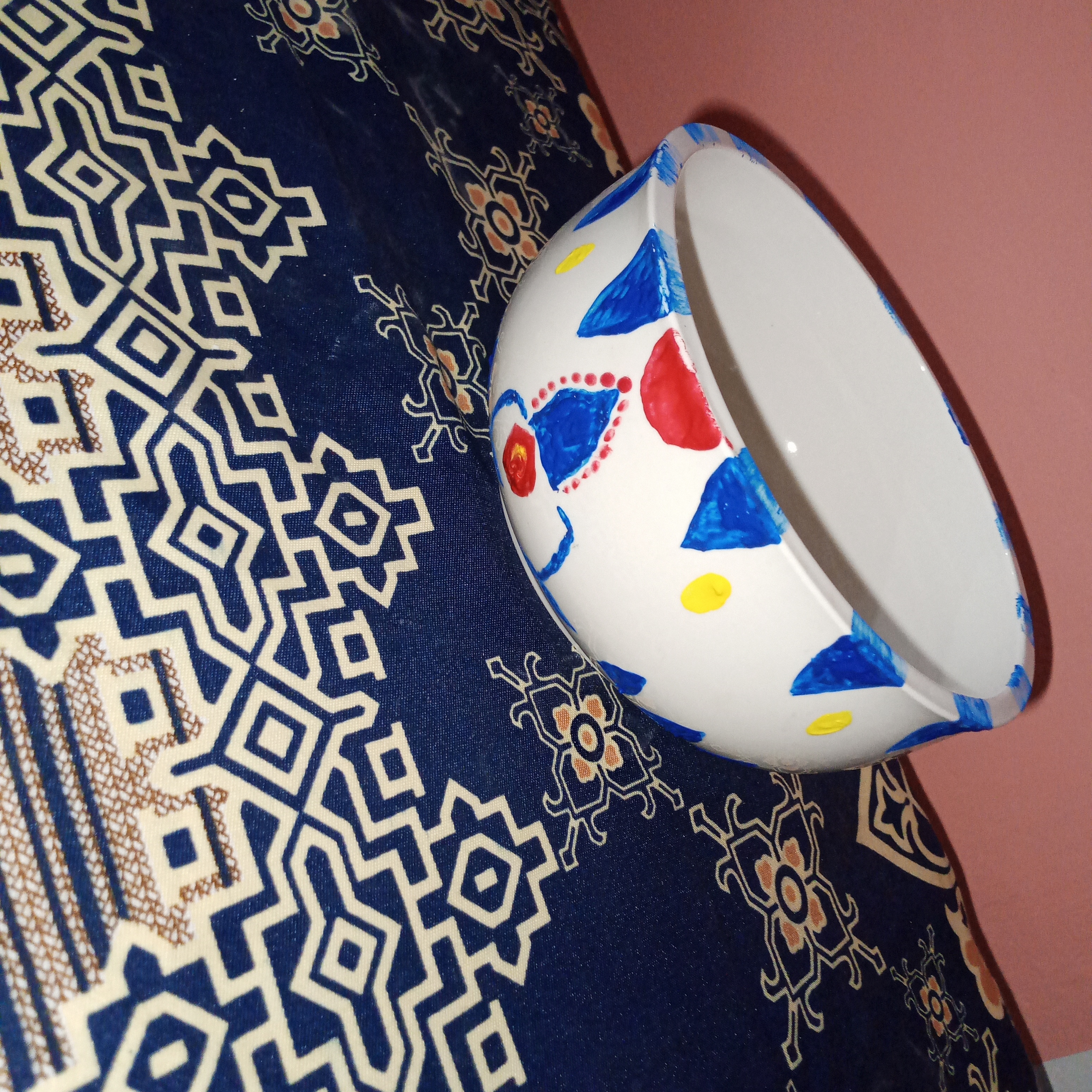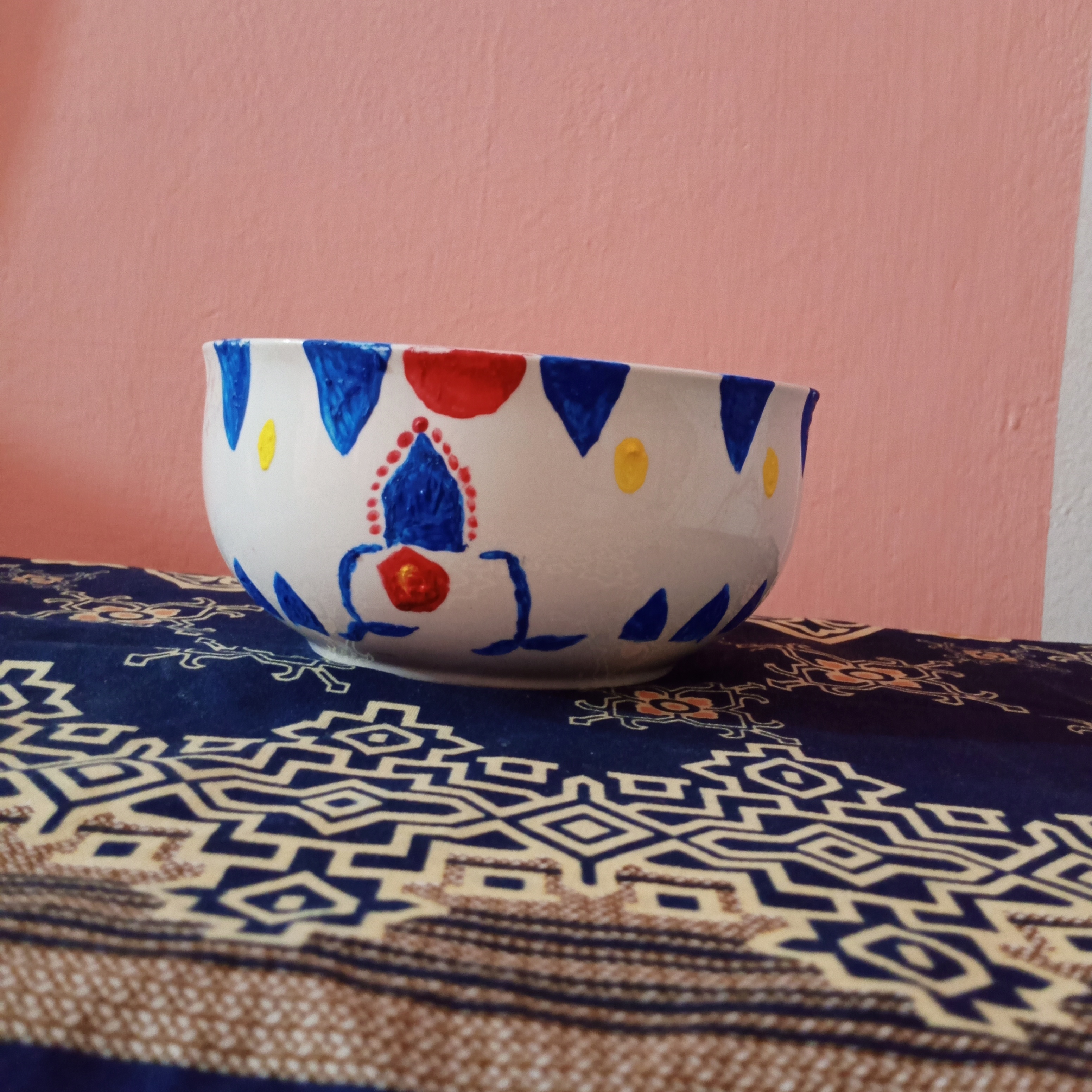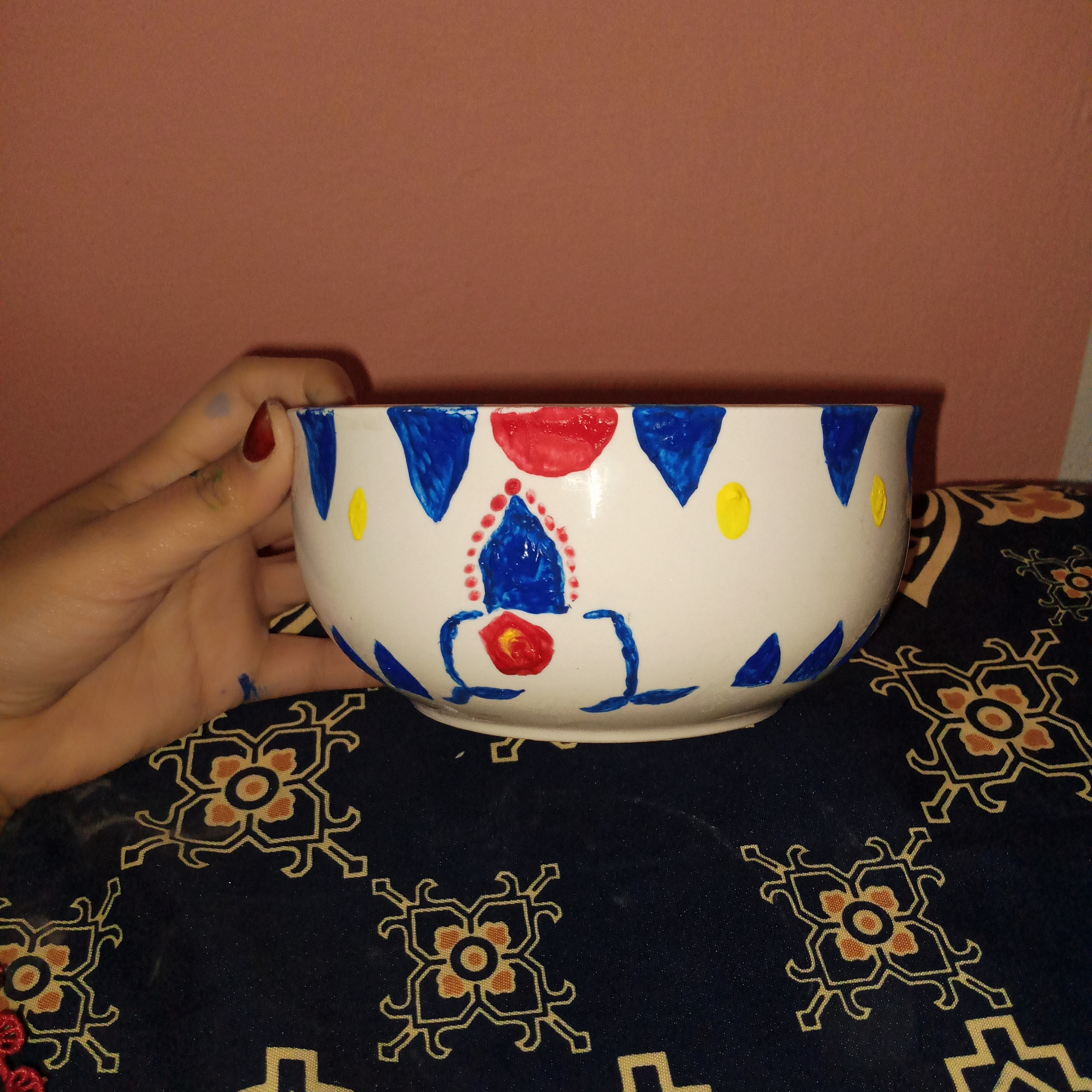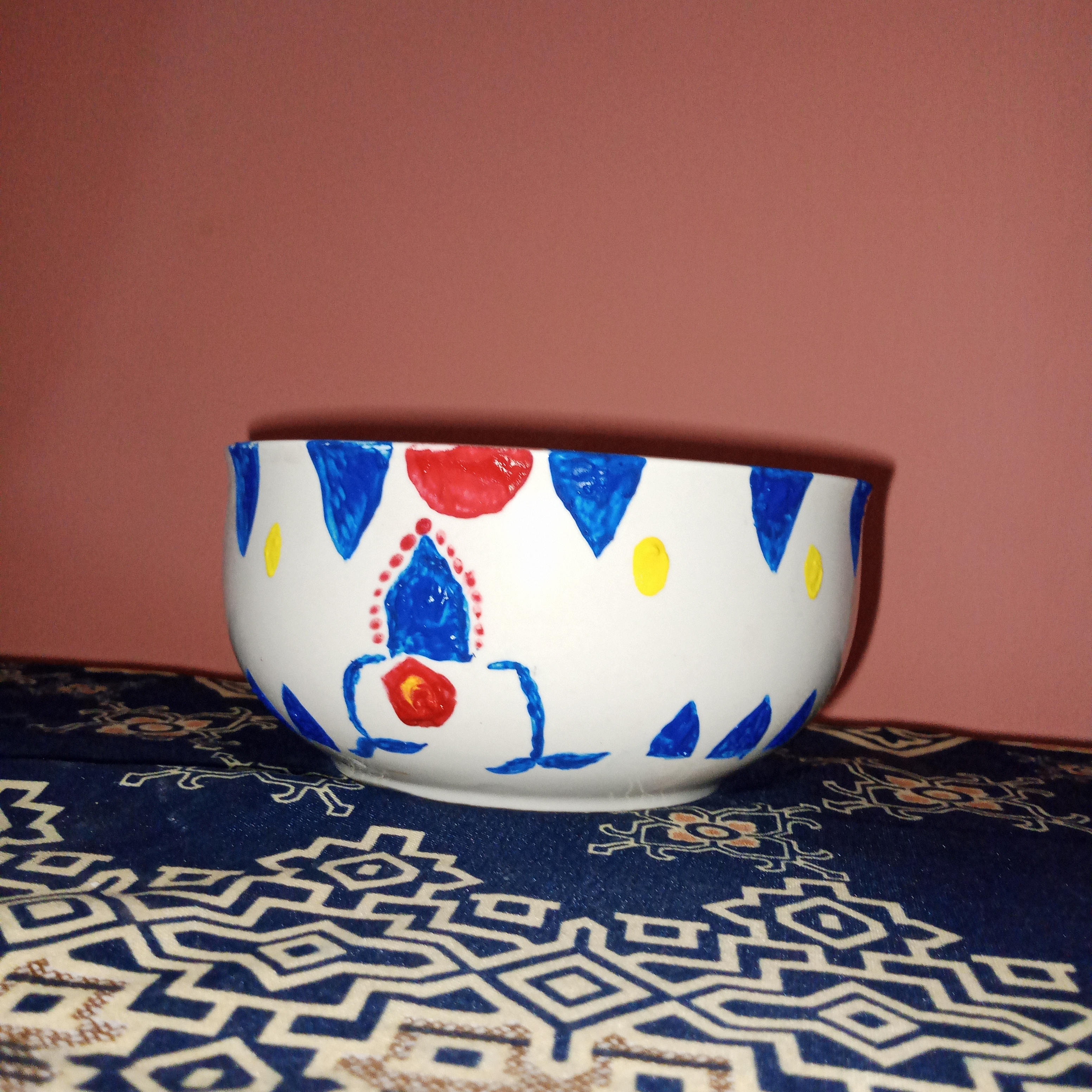Guys I am not satisfied with the final result of my painting. I tried my best. And followed the steps that were taught in the challenge. But guys the result was not exactly what I expected. The bowl I used for the painting had a very simple design on the sides. Because of this I did not have much space or inspiration to create something more creative. I wanted to add more beautiful patterns and colors. But the shape and design of the bowl made it a little difficult for me. So I had to keep the painting simple. Although I worked carefully. I think I could have done better if the bowl had a better design.