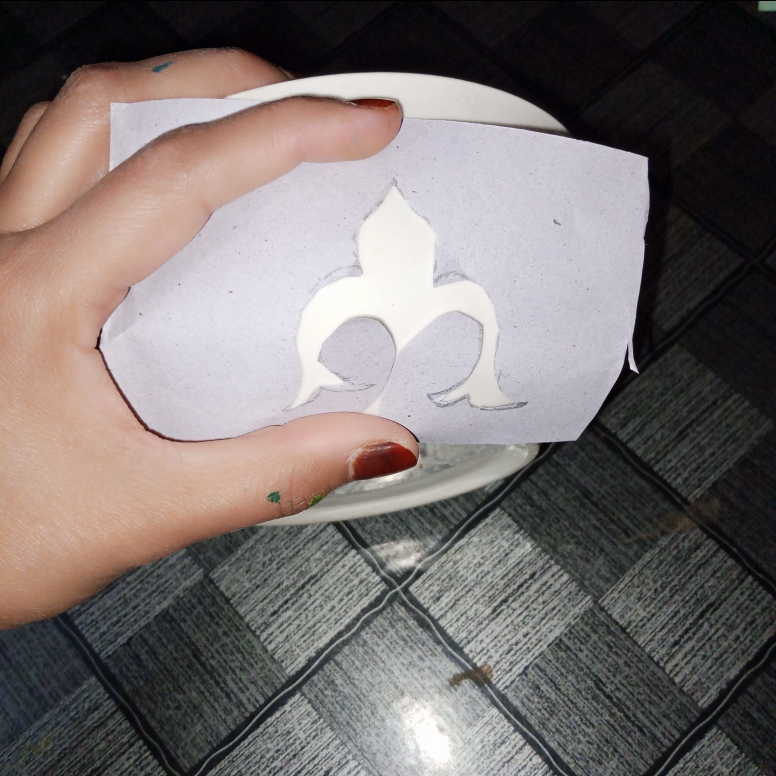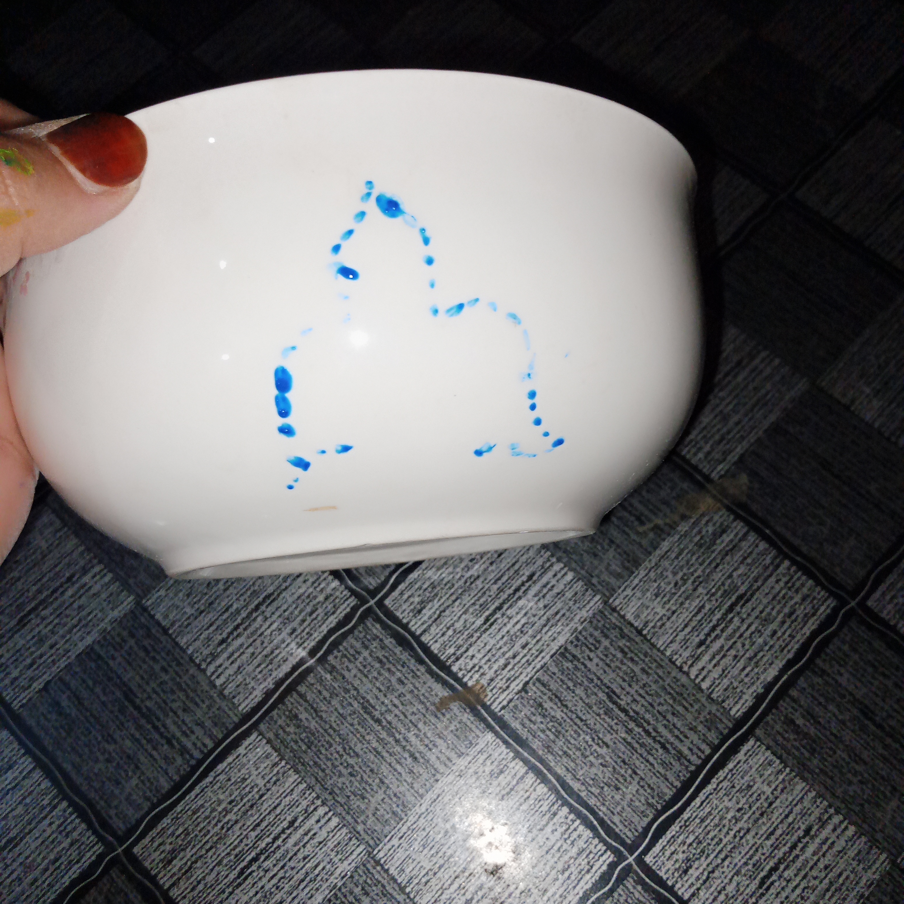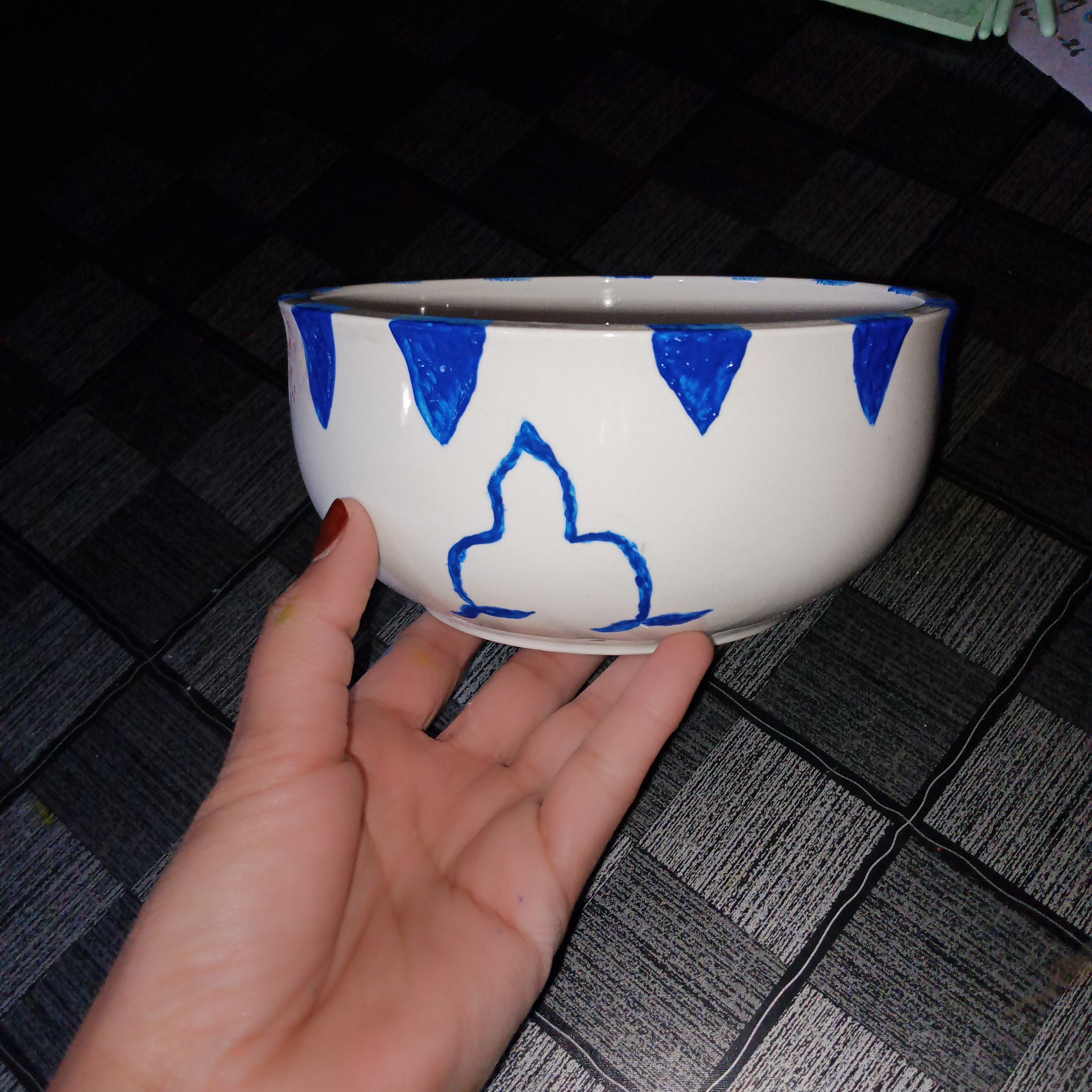 - I made a small design on a piece of paper and cut it out. Then I placed it on top of the ceramic bowl. And drew it with the help of light paint dots. After that I completely shaped the time design with the help of blue paint.