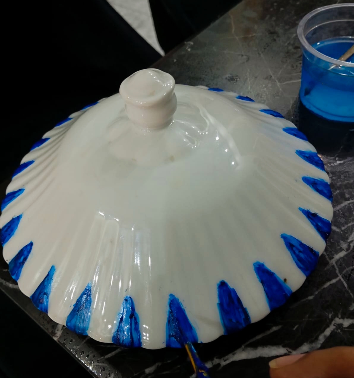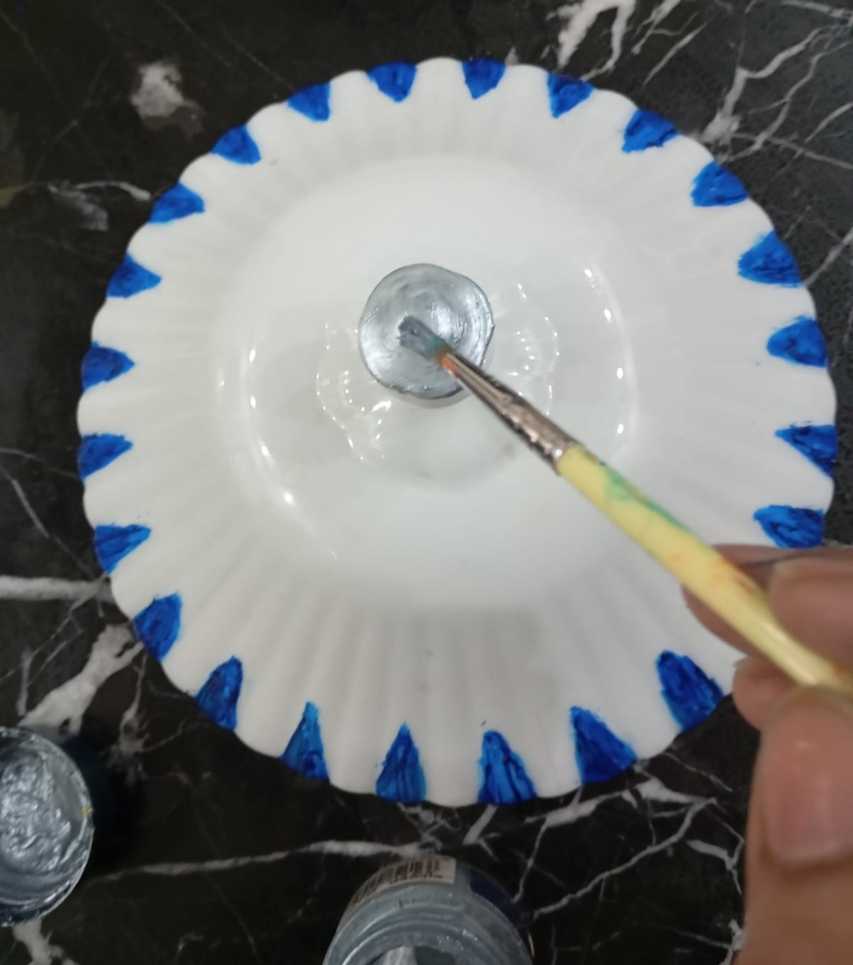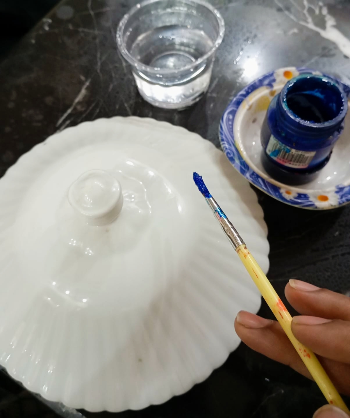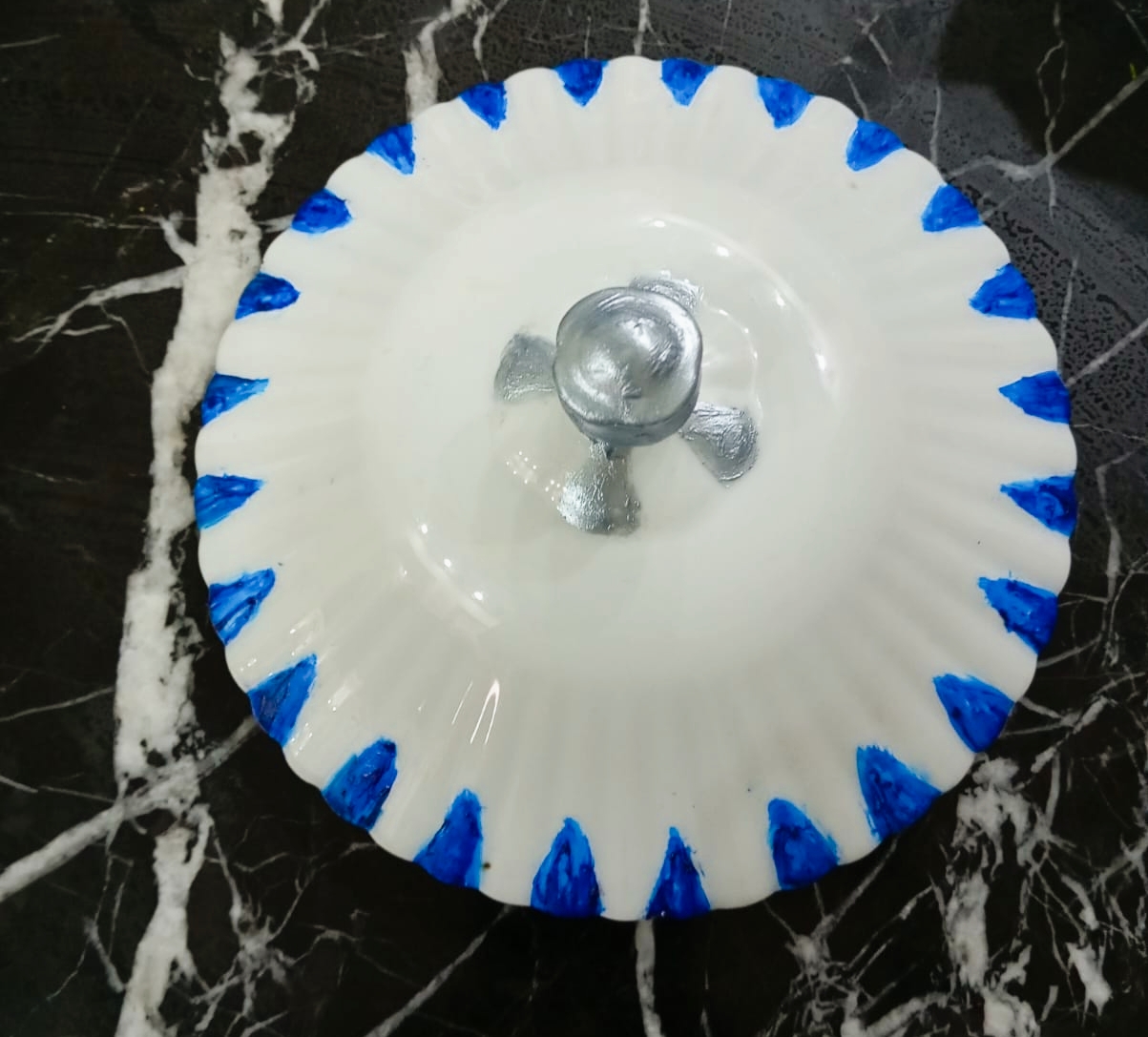 - By first I started with ceramics pot lid .I chosen blue ๐ต acrylic paint I applied on the edges of the lid throughout the whole lid and let it dry.as you shown in image.