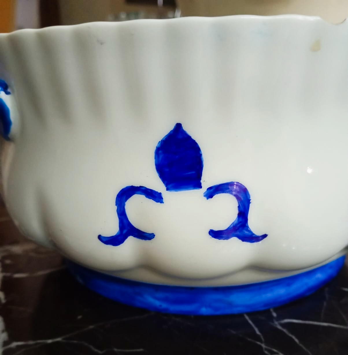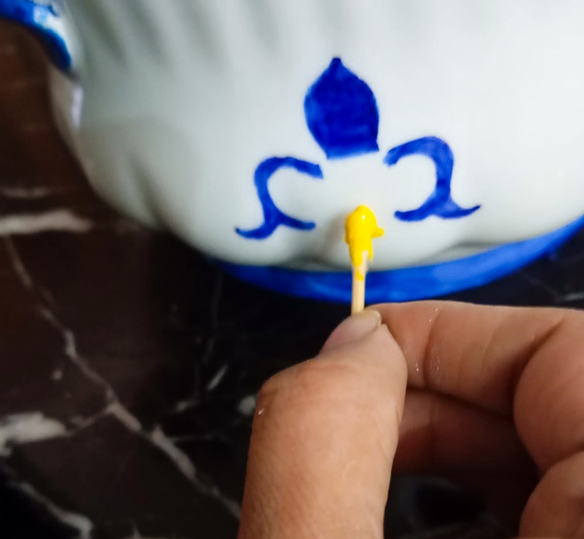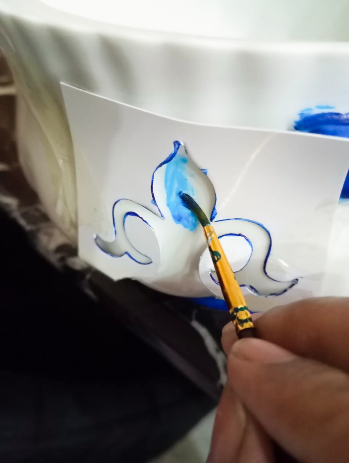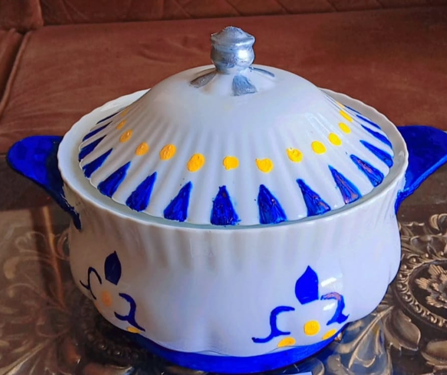 - By first I started with ceramics pot lid .I chosen blue ๐ต acrylic paint I applied on the edges of the lid throughout the whole lid and let it dry.as you shown in image.