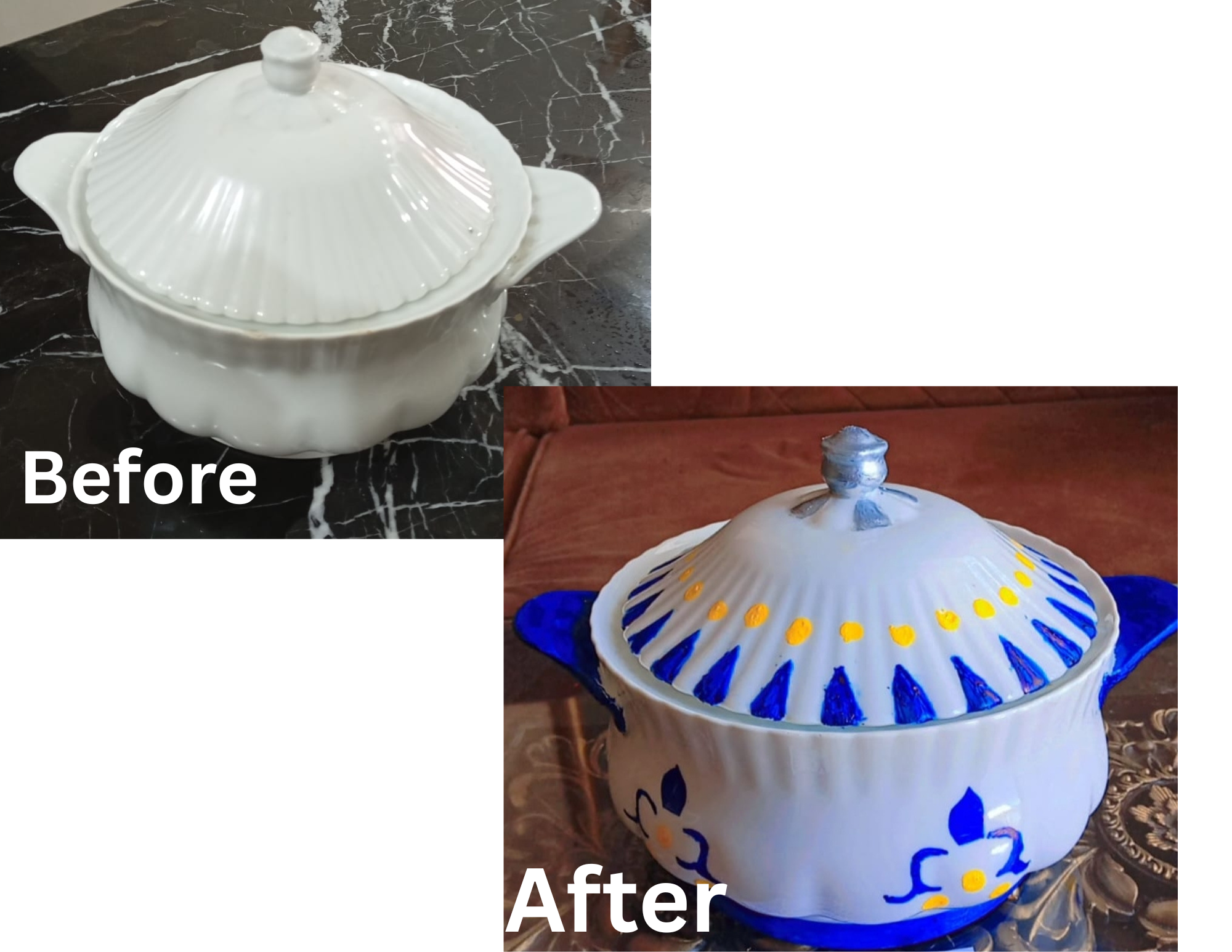 - At the end I like to add yellow paint in dots style for that I used cotton bud and guys you can see how easily done from it ,I also stamped yellow dots on the lid ..the colour combination matters in pottery painting you can see the difference before and after in images it's simple and easy way to express your personalized creation by your hand and gives new look to your ceramics pot .