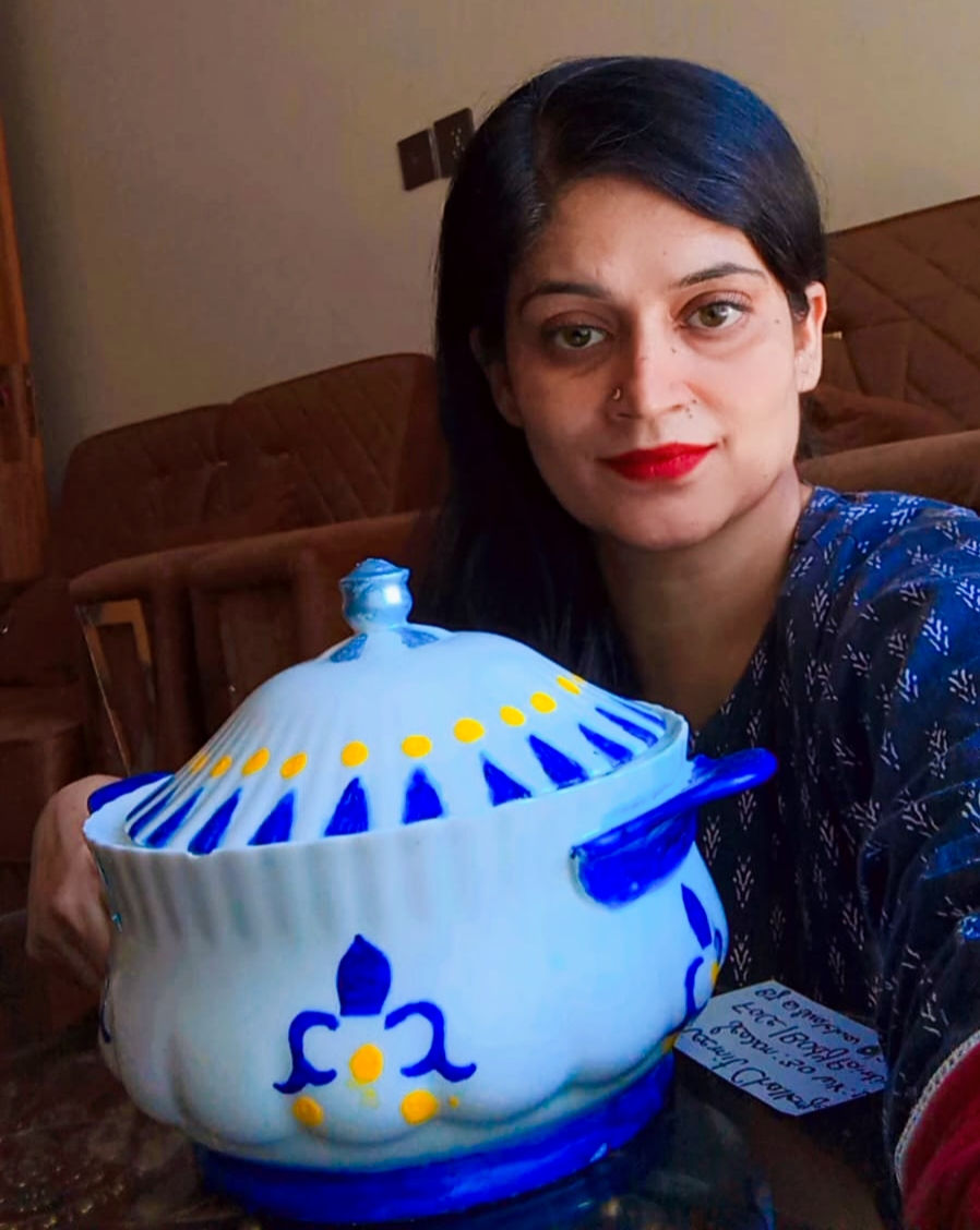 Share with us ceramics painting,create any design according to your choice on ceramics pot (Mug ,cup ,glass, plate any decorative piece)it should be ceramic pot... share step by step procedure with images (6-Marks)