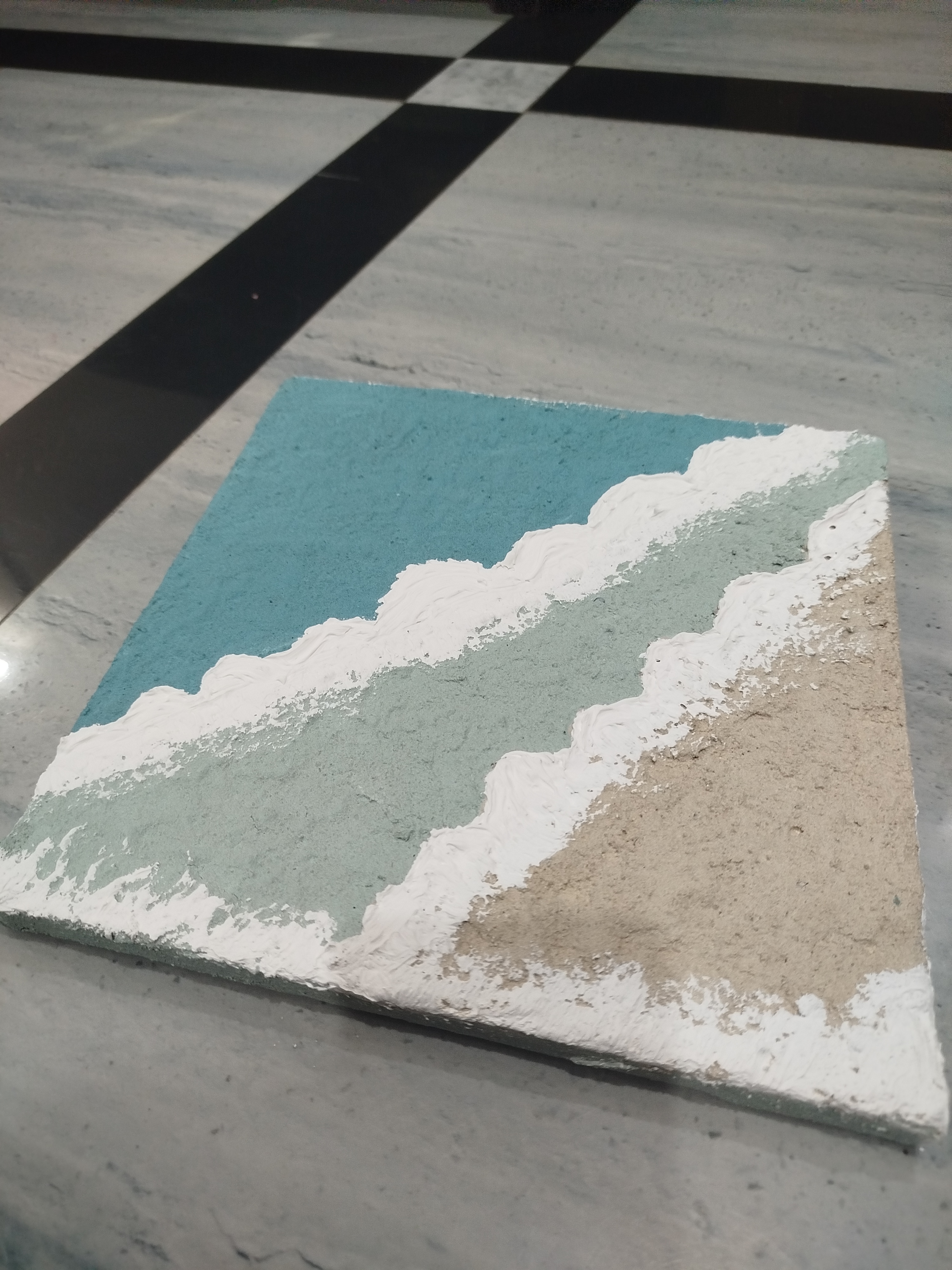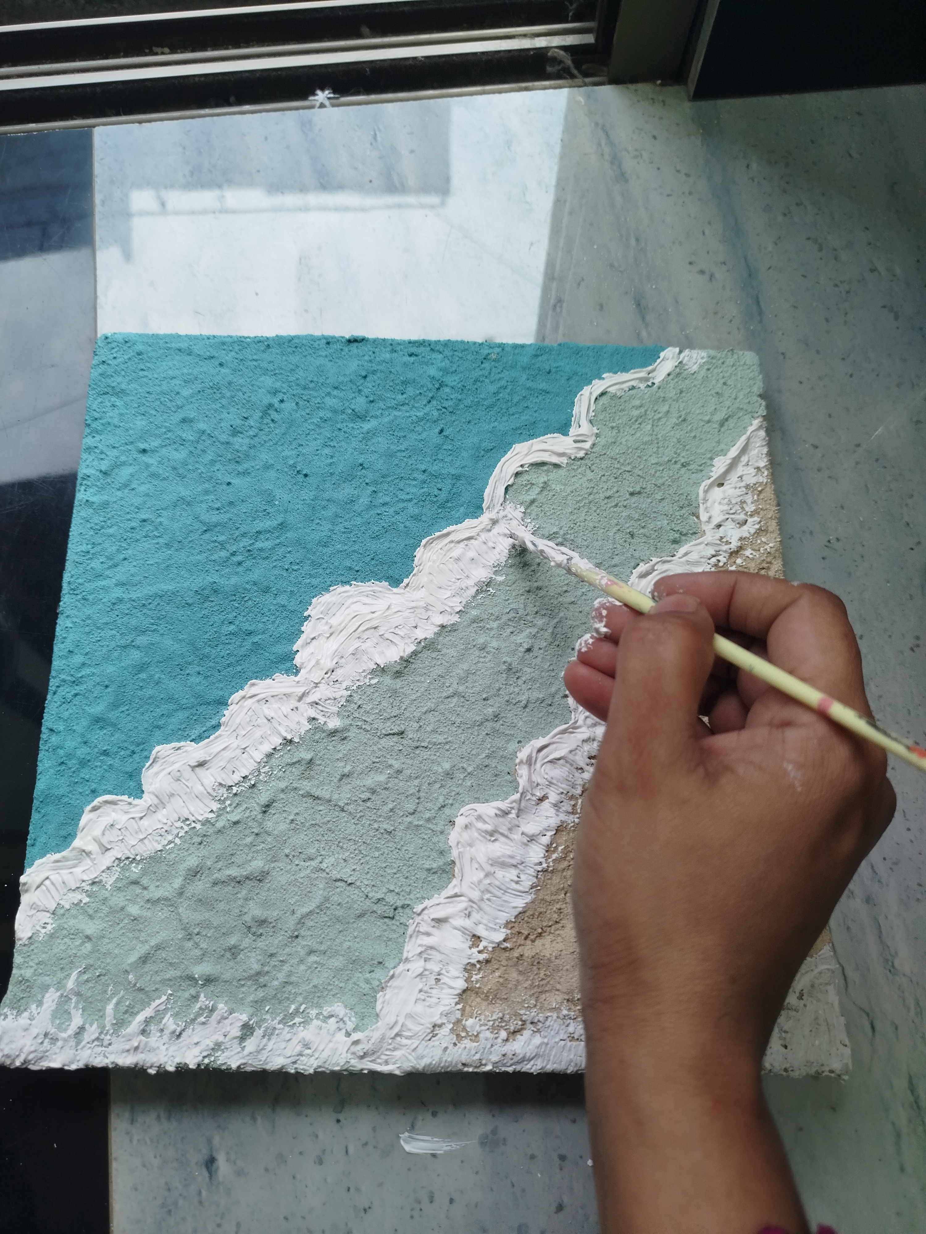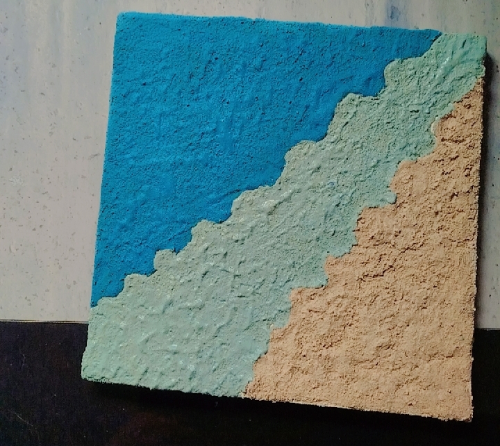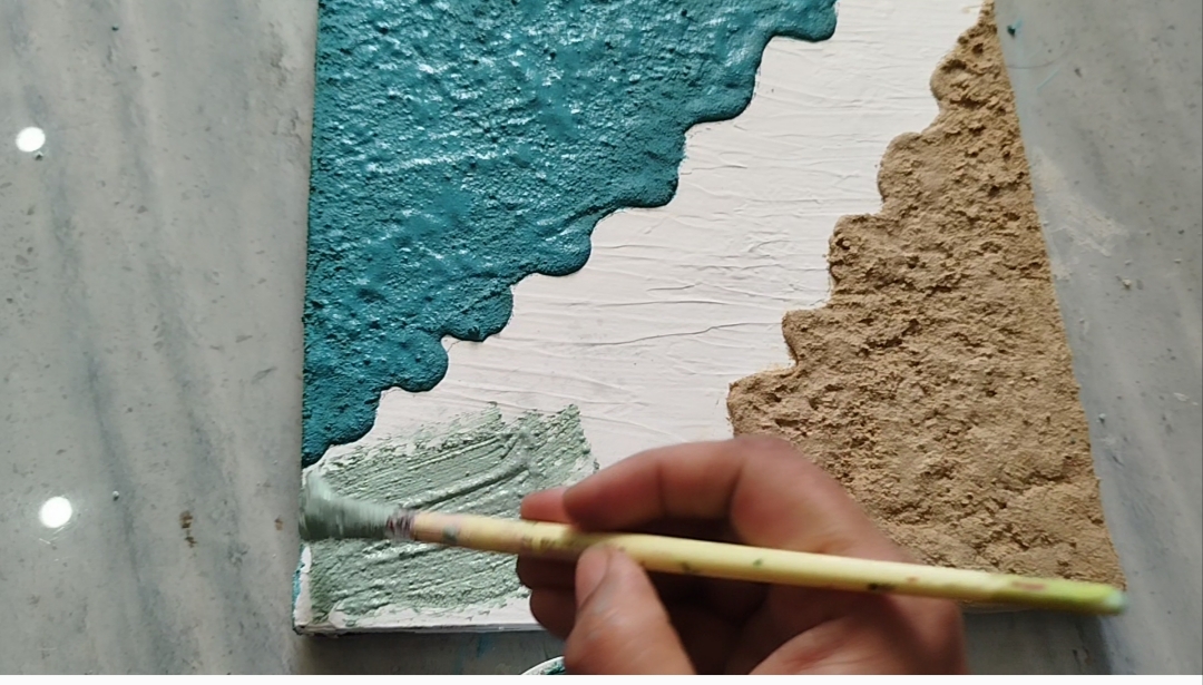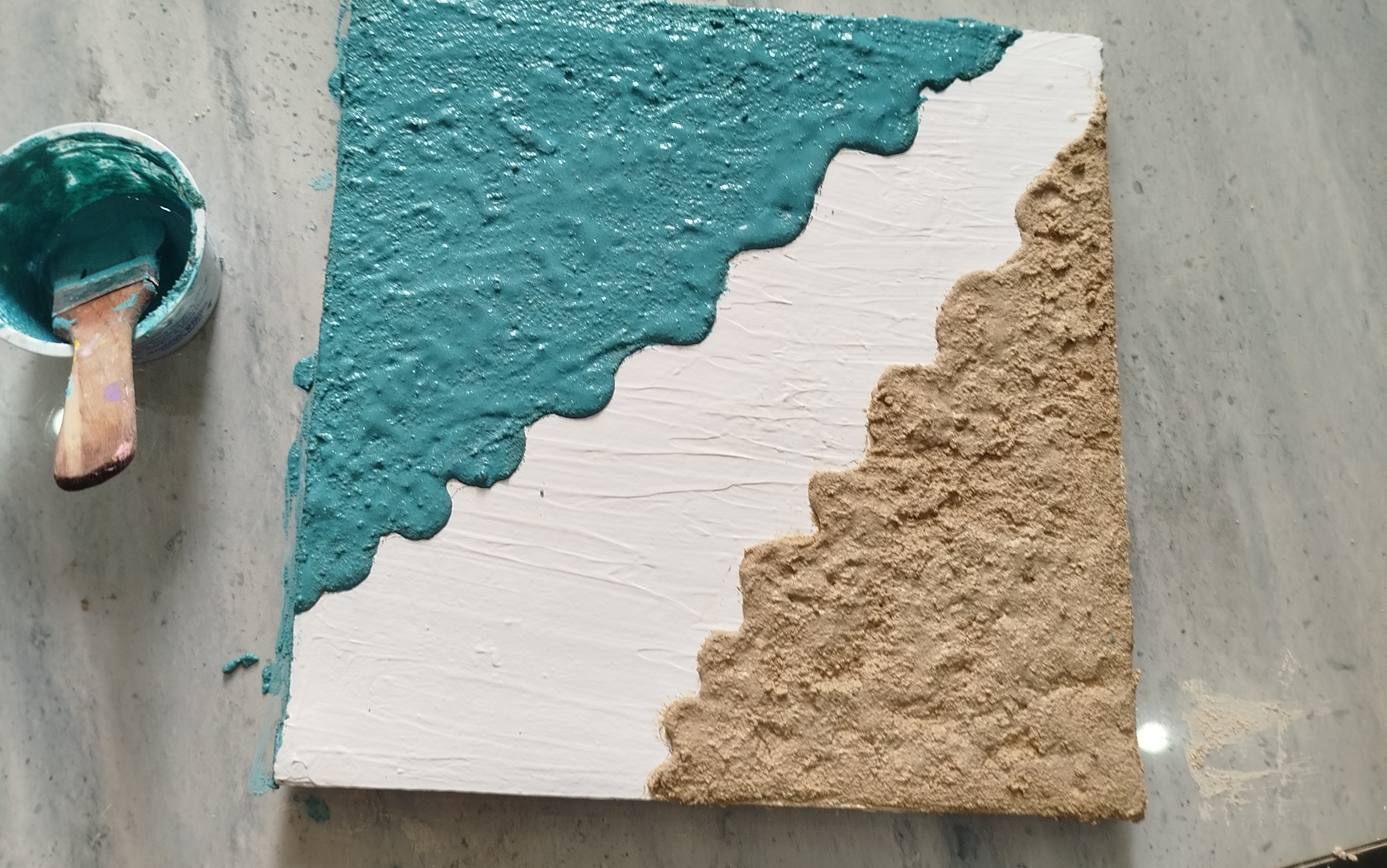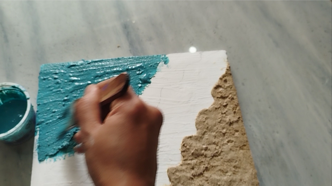 • In third step i made an other texture paste in which blue acrylic paint ,white glued and sand ... Mixed well the paste is ready .now applied this sea water 🌊 paste on it by the help of paint 🖌️ and again set a side let it dry ...till dried completely then moved on middle part of this sea beach texture painting project.