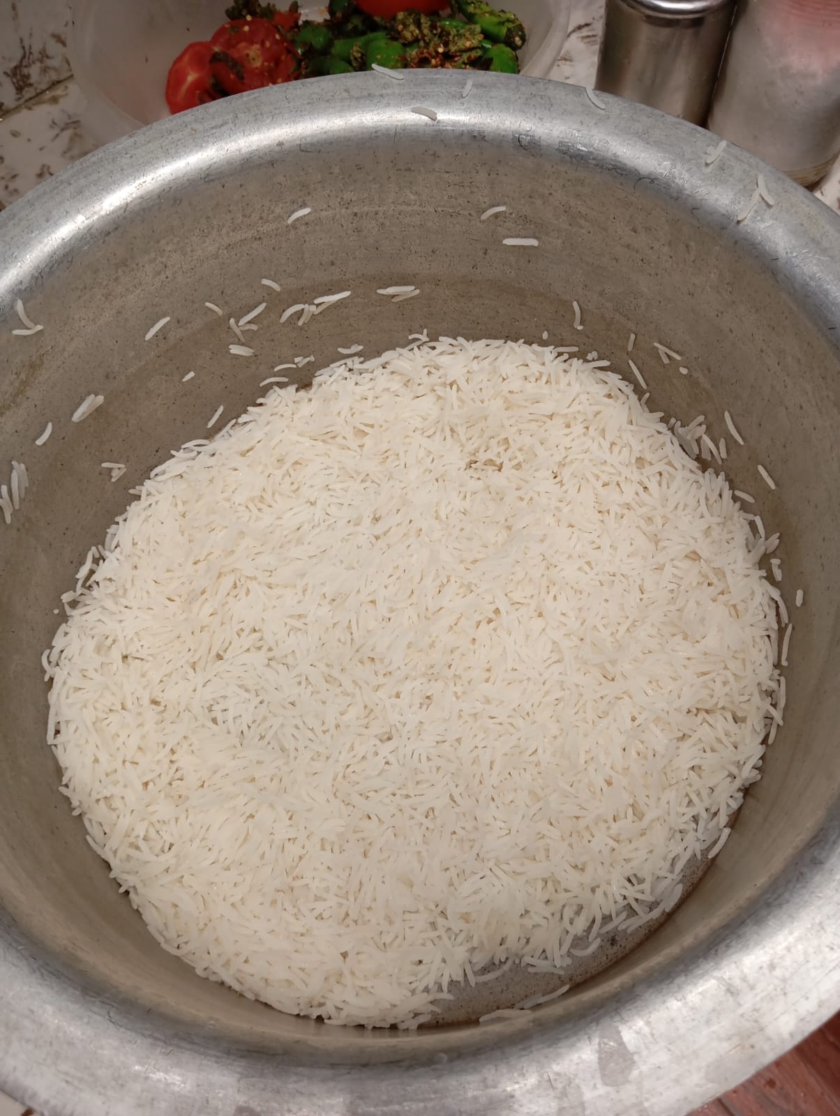 Take a large pen added water and salt in it.add soaked rice in it ,cooked rice till completely cooked after that strained out water from rice .
