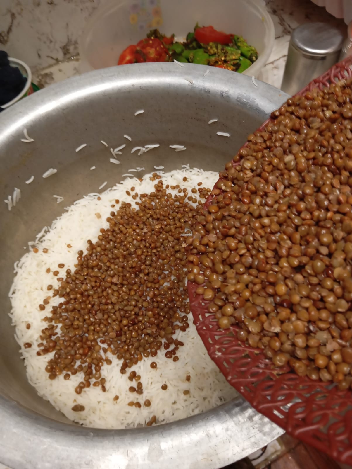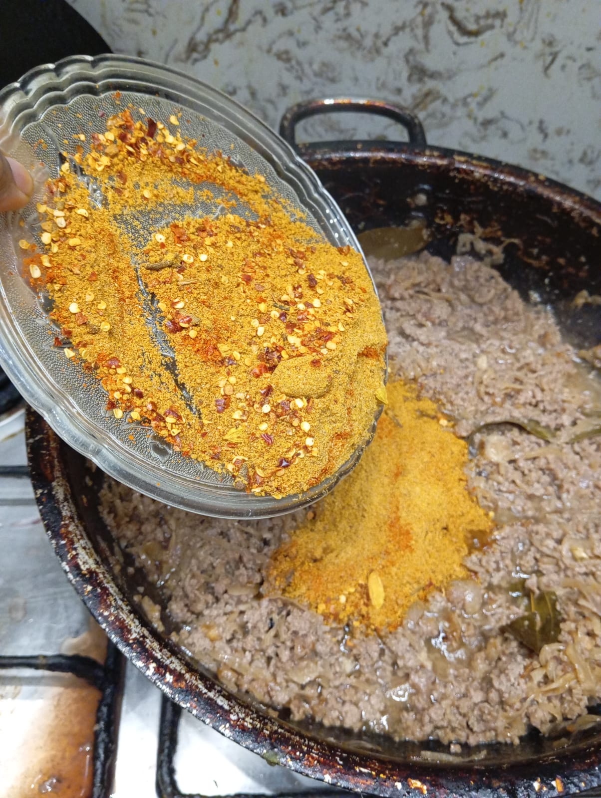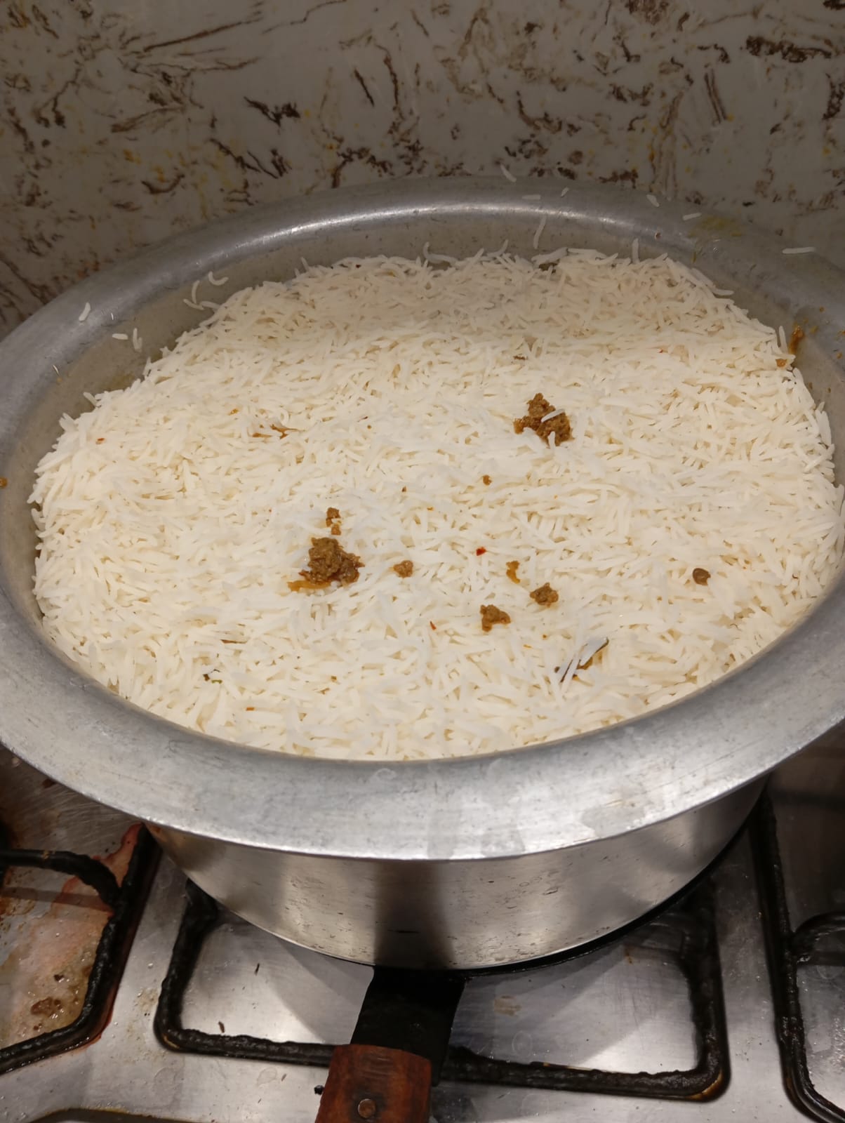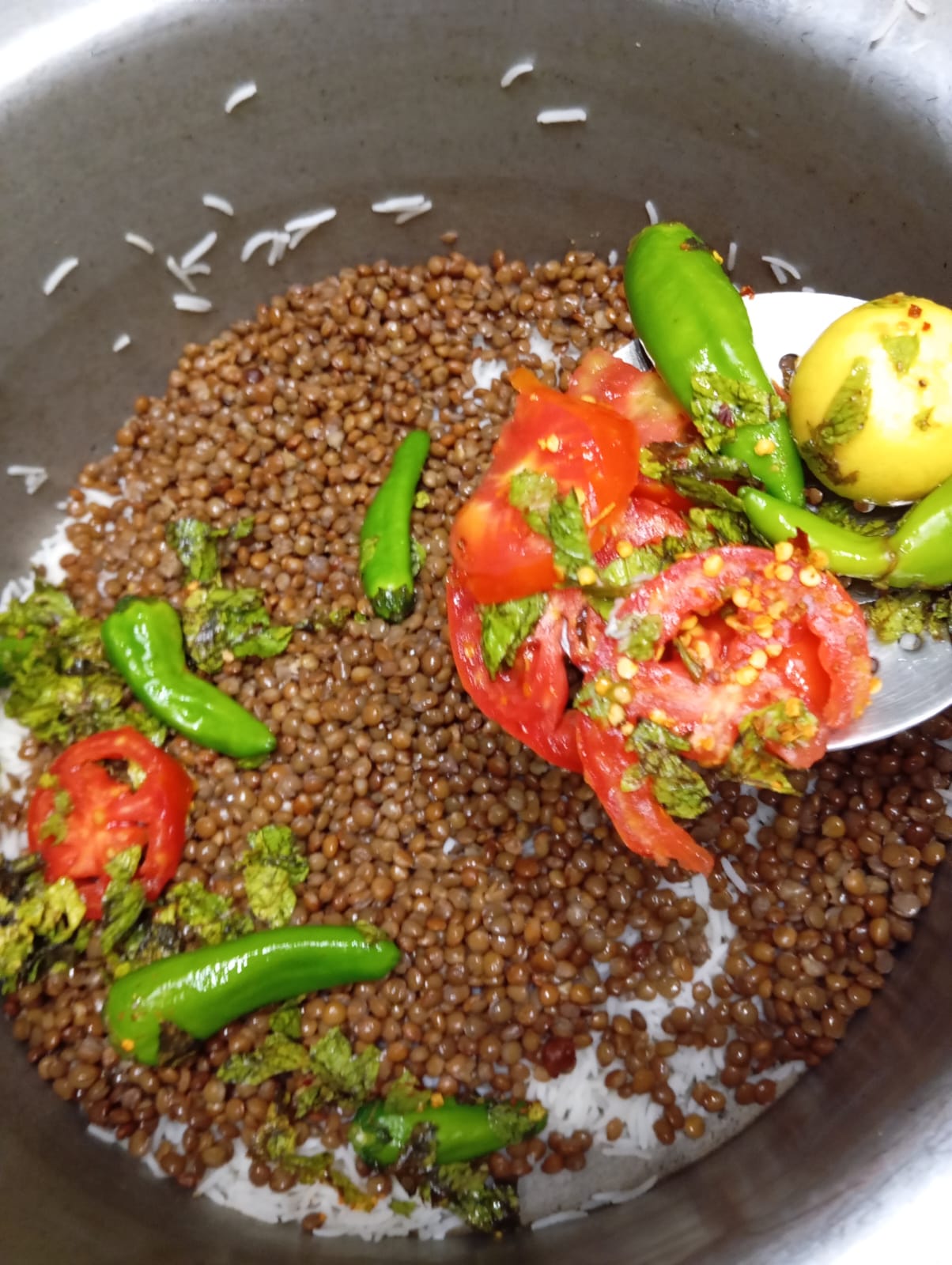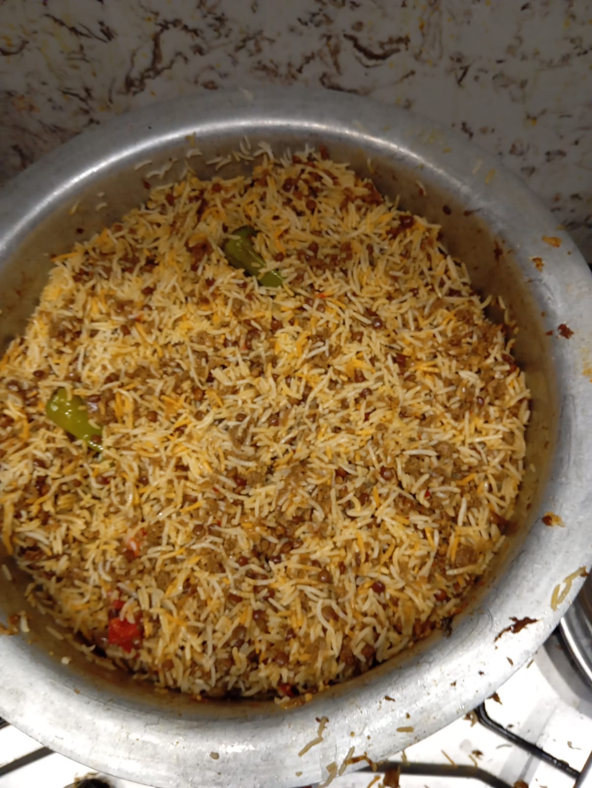 First l sorted boiled rice layer on bottom of the pot then layed with green masala in which consist of tomato,mint and green chillies then added black lentils then added spicy beef minced . Repeat all layers and assembled all ingredients and covered the lid on low flame to 15 minutes.