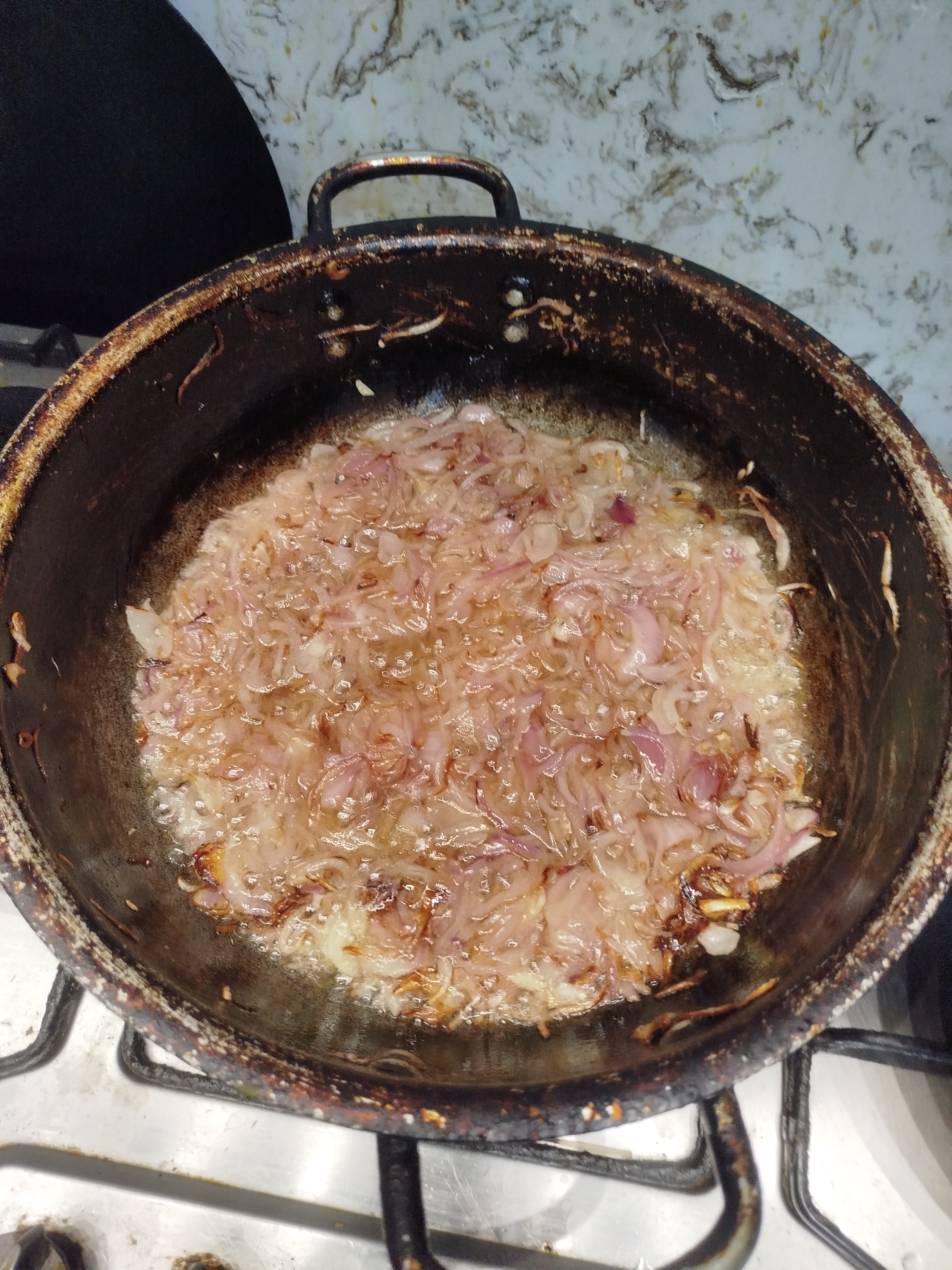 Peeled off the onion and cut in fine sliced,take a large pan added oil and fried onions in it when it was golden in colour.Aotje side washed the black lentils and boiled till it became soft then strained out water and let it cool.