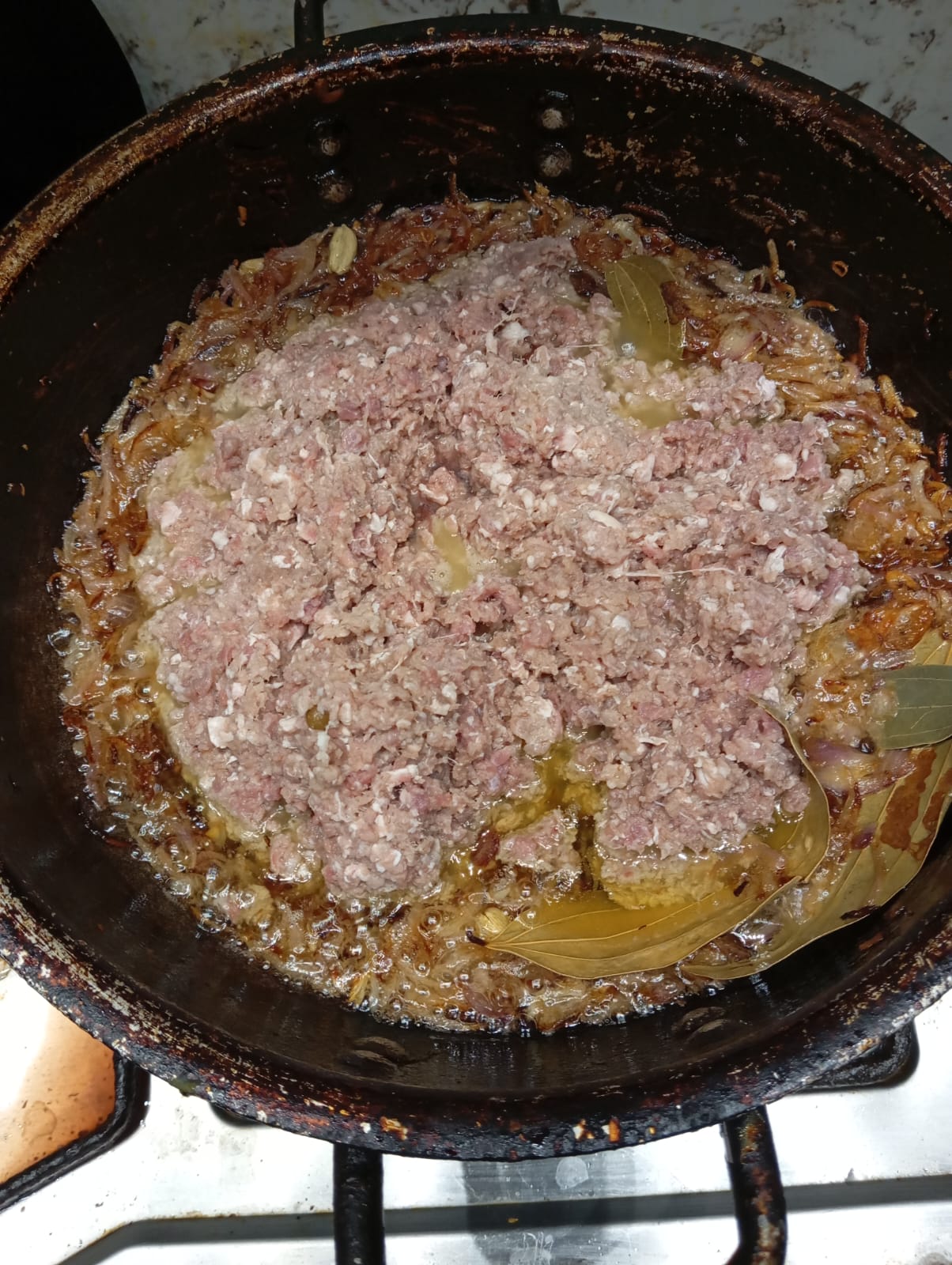 Now the onion tired golden add beef minced in it and saute at medium flame ,added ginger garlic paste and fried well .Added whole spices in which green ilachi , black pepper, clove and cinnamon sticks.