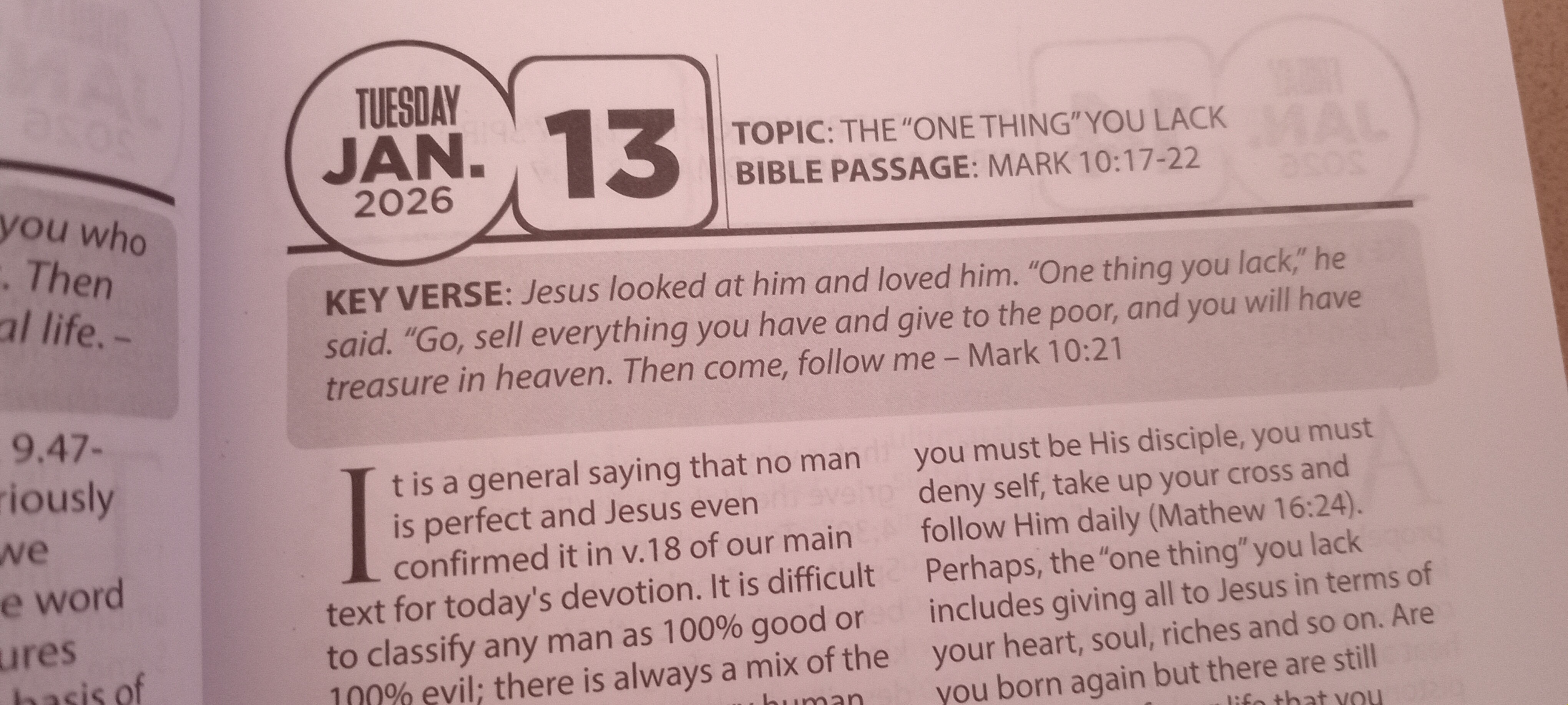 The Presbyterian Church of Nigeria Family Altar devotional daily guide. The topic for 13th January was THE “ONE THING” YOU LACK. The moral lessons from the devotion: Having all without eternal life is as good as having nothing. Working on our weaknesses to please God. If you will follow Christ, you must deny yourself. We started the prayer a bit late, as against the normal 5am to 5:15am, when it was about 6am we woke up and rushed over it for school runs.I finished bathing my son and also prepared myself, it was already 7am. What will I do? I had to carry his food to meet up with the school bus. Days we miss the school bus, means I have to drop him before going to my place of assignment.