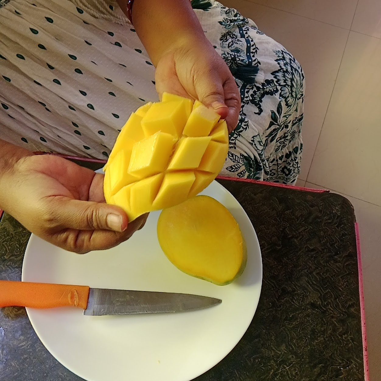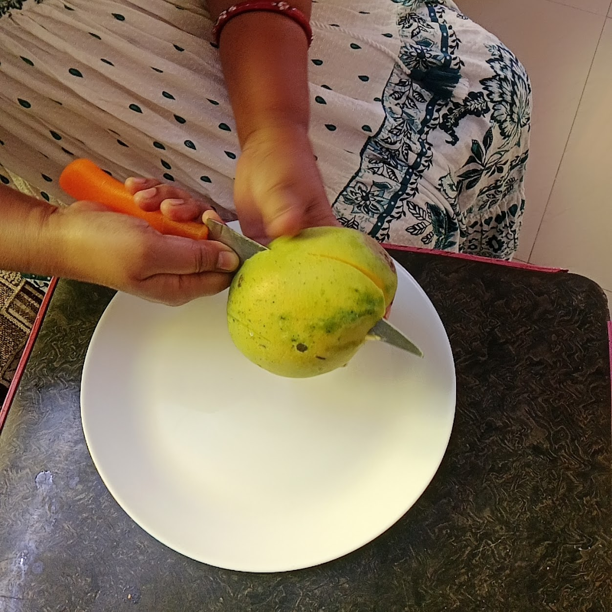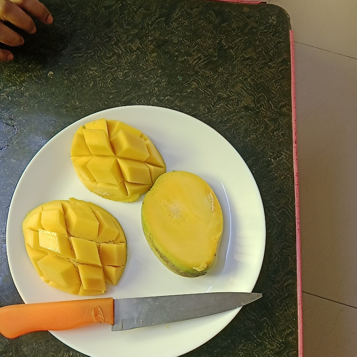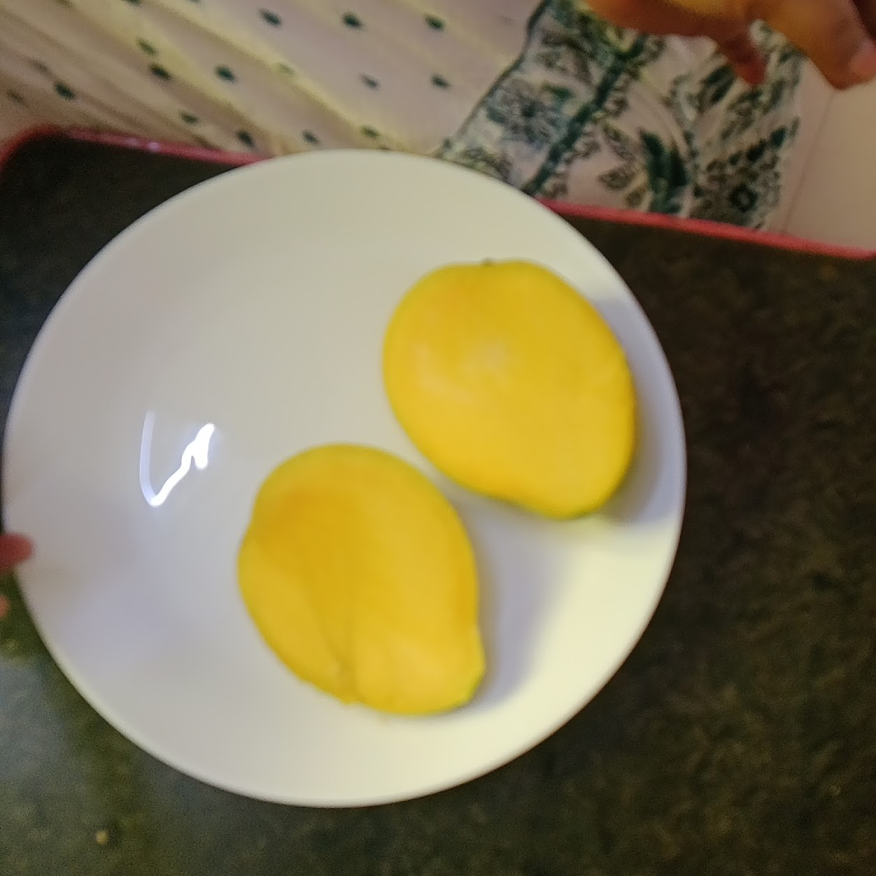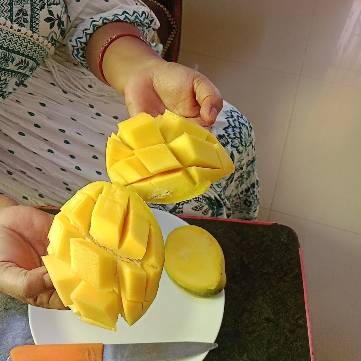After cutting them, I took selfies and photos with them, and then shared them with everyone. The fruit was very delicious. I had heard that the fruits of the second season are always very tasty, and now that has been proven true. Everyone who ate them said they were delicious. I gave two fruits each to my friend who lives nearby and to my elder brother's family. I felt a sense of satisfaction when I gave them the fruits. Sharing the fruits plucked from the mango tree in our home garden was a fulfilling experience.