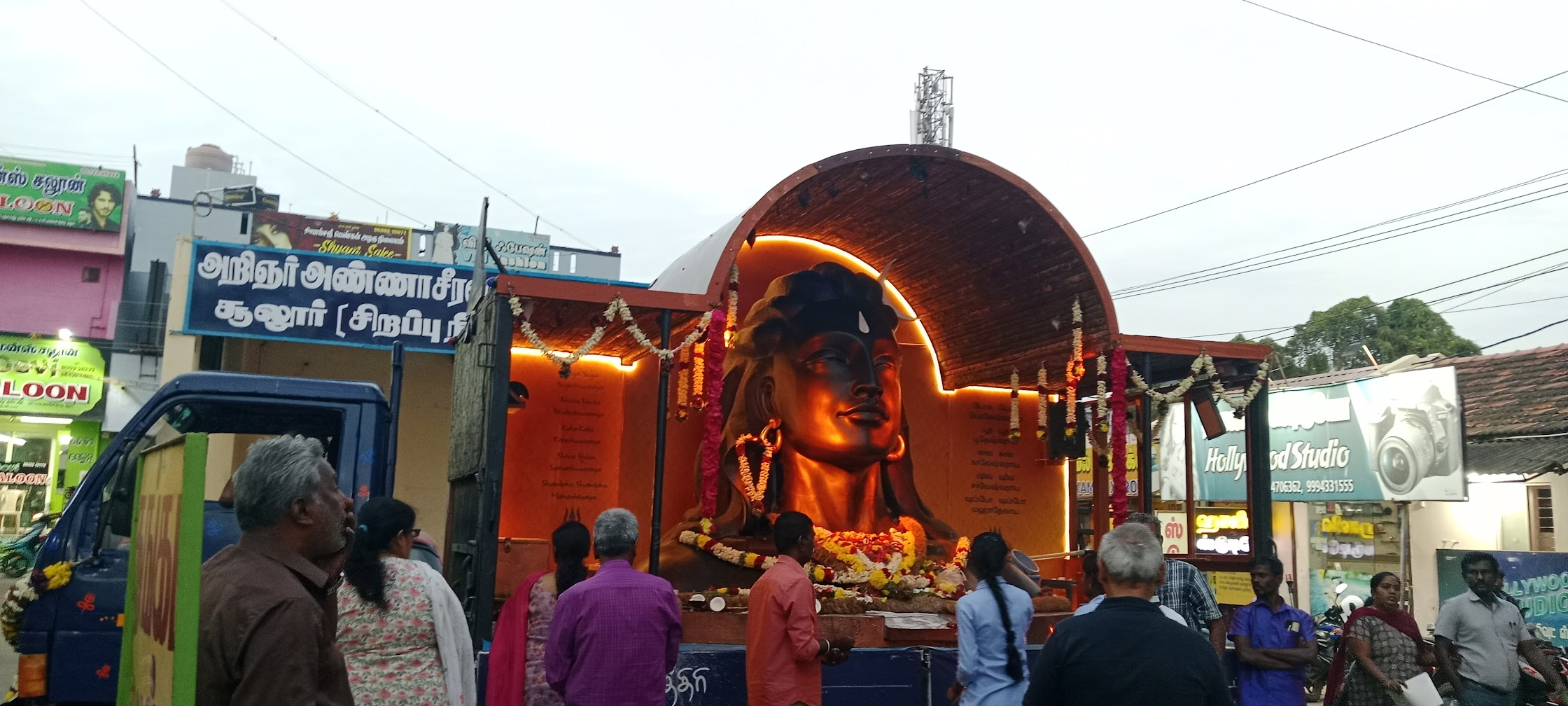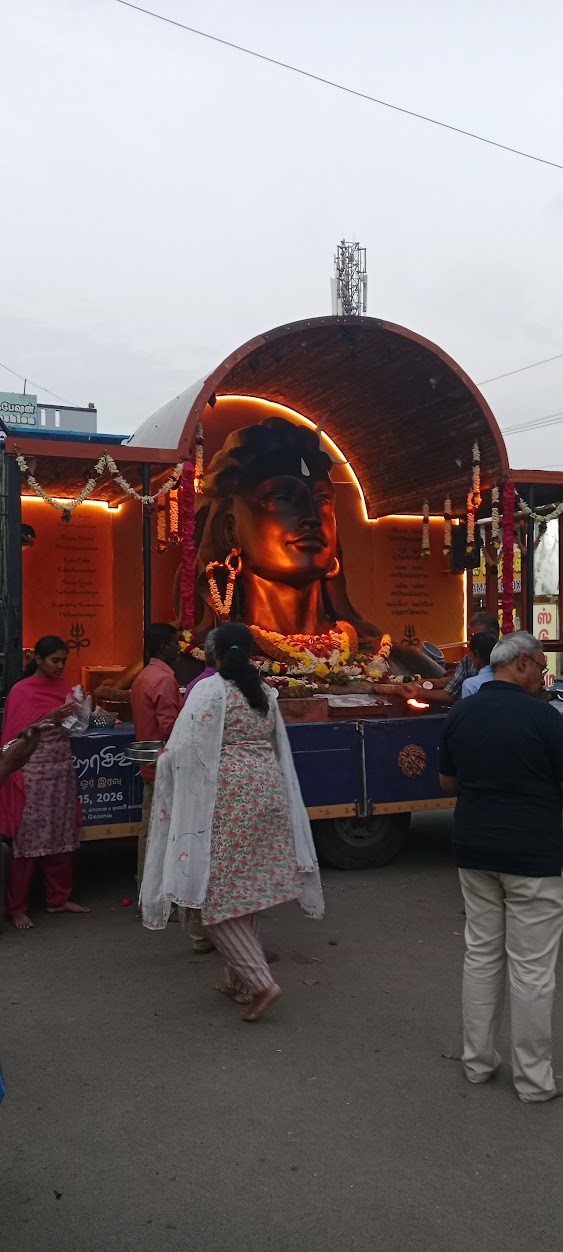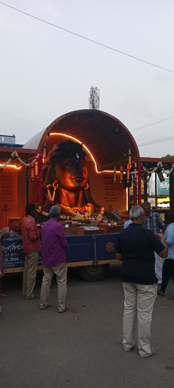 In the evening, I went to the market in my town. At that time, a chariot from the Isha Yoga Center, which is very famous in Coimbatore, had arrived there. I went to see it.