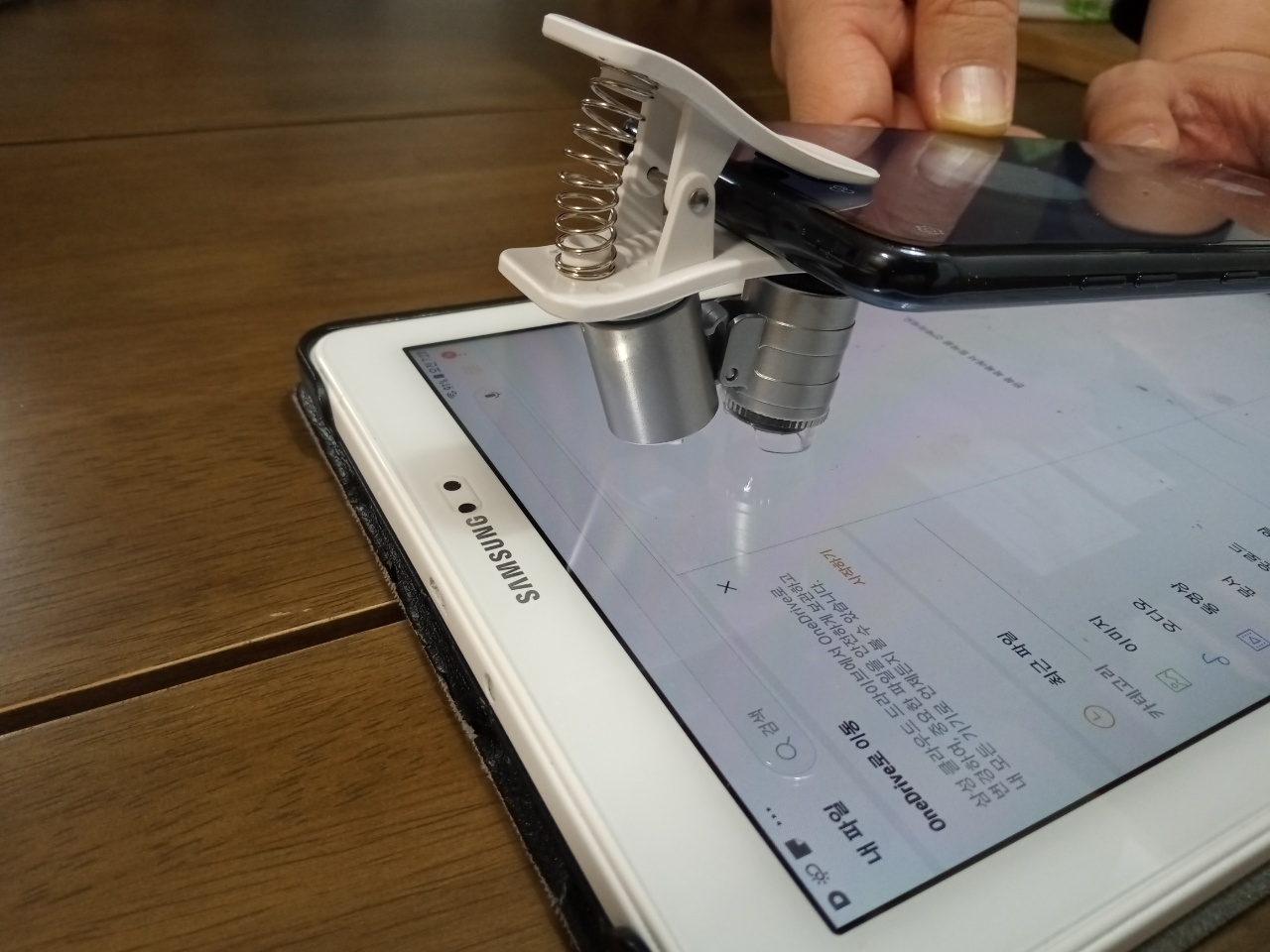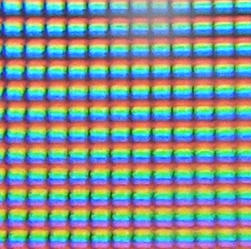 휴대폰 현미경으로 스마트기기 화면을 보면 작은 픽셀들이 보이는데 사진을 찍은 후 조금만 더 확대하면 삼원색의 램프들이 무수히 반복되어 있는 모습을 볼 수 있습니다