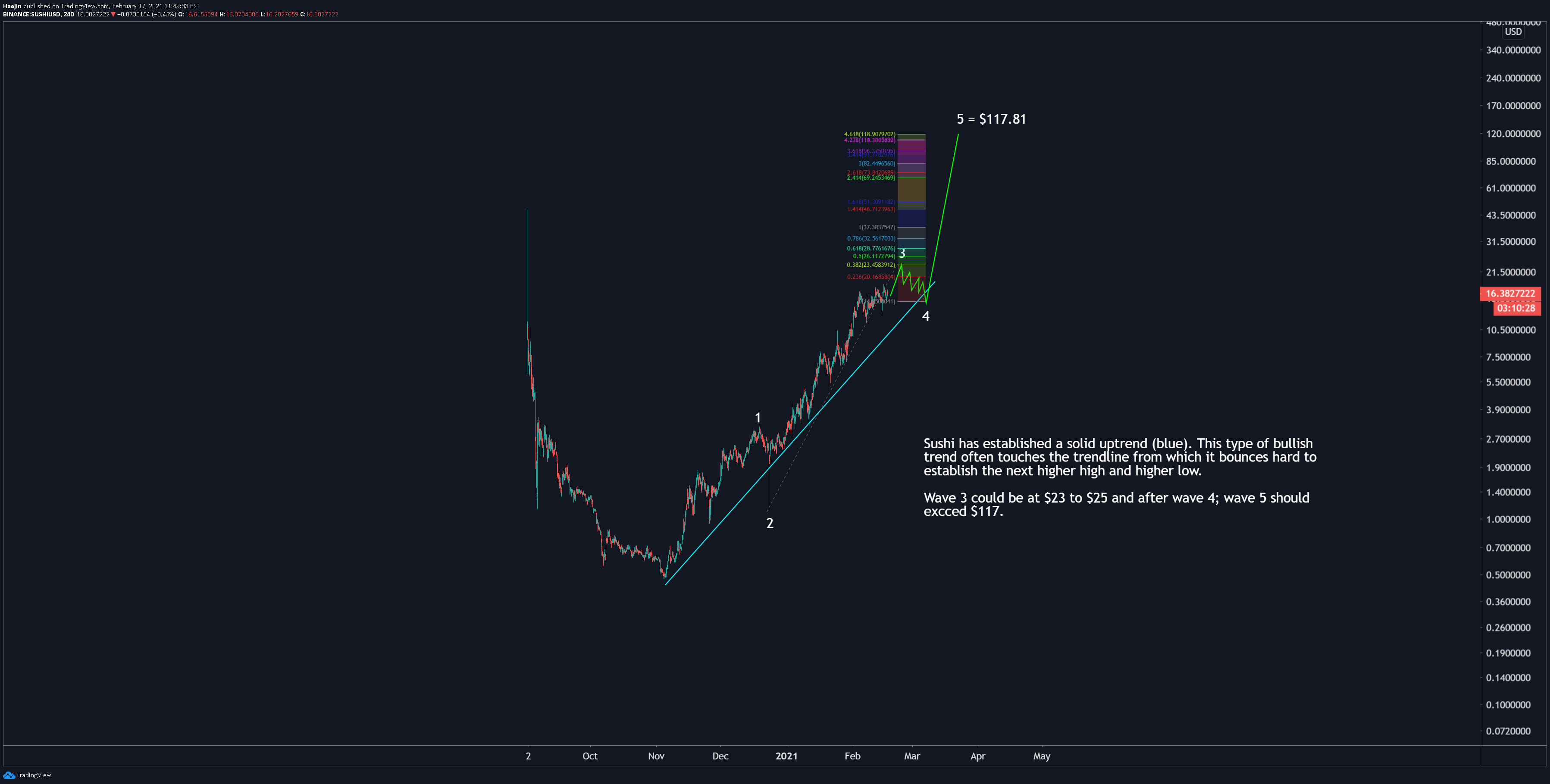 SUSHI Anyone?munsters (84)in #tic • 5 years ago Well established bullish trend! Wave 3 is likely completing but wave 5 holds much higher highs!
