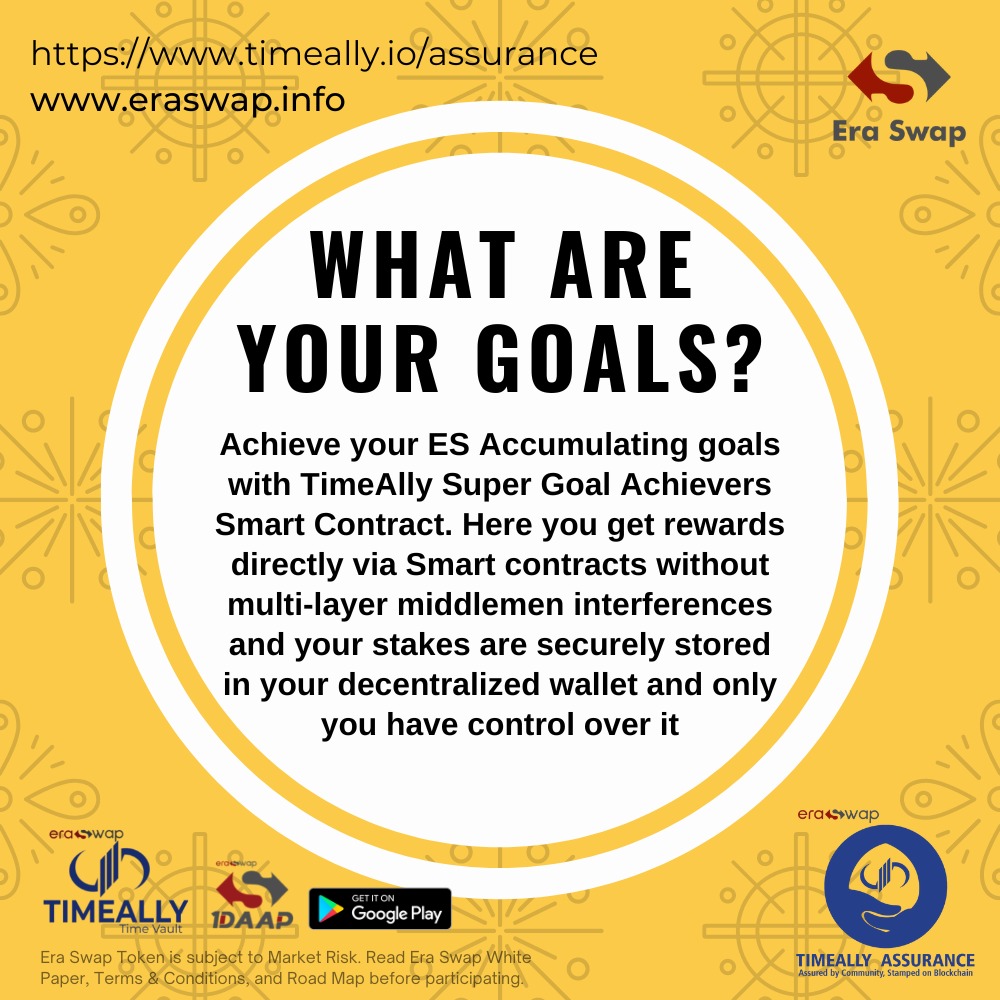 Achieve your ES Accumulating goals with TimeAlly Super Goal Achievers Smart Contracts. Here you get rewards directly via smart contracts without multi-layer middlemen interference and you stakes are securely stored in your decentralized wallet and only you have control over it.