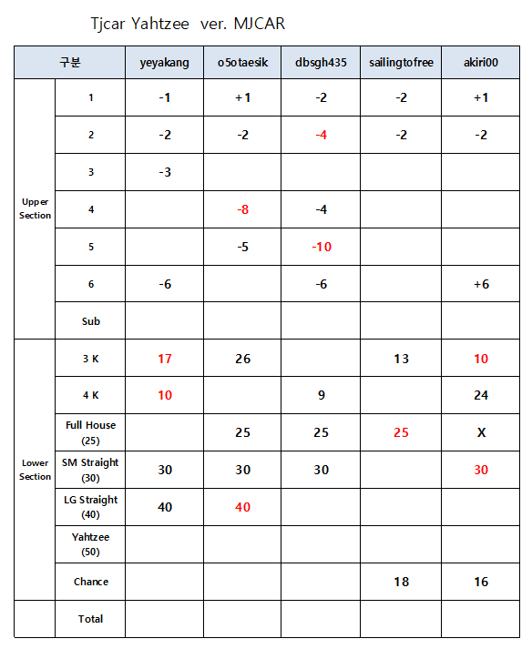1차 5개 주사위의 결과와, 고정할 주사위, 다시 던질 주사위를 댓글에 표시해 주세요.