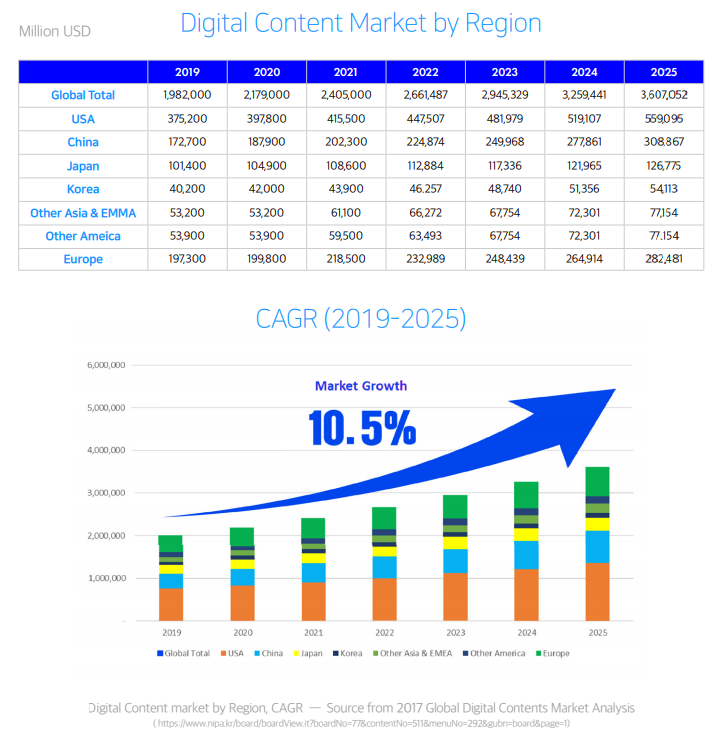 아래 그림은 '정보통신산업진흥원'에서 찾은 디지털 컨텐츠 시장에 관한 전망치다. 글로벌 디지털 컨텐츠 시장은 2012년부터 연 평균 10.5%의 속도로 빠르게 성장해왔는데 이 기조에 따르면 2019년에는 약 2조 달러에 육박할 것으로 예상되고 있다. 디지털 컨텐츠는 혁신적인 방송매체나 플랫폼이 생겨나면서, 빠르게 확산되고 동시에 변화해왔다. 매체 기술의 발달에 따라 전통적인 텍스트, 이미지, 오디오 등 다양한 컨텐츠로 빠르게 재창조됐고, 더 큰 부가가치를 만들어내고 있다. 쉽게 생각해보면 10여 년 전엔 활발하지 못했던 아프리카 TV, 웹툰 서비스, 유투브 등의 다양한 디지털 컨텐츠가 매일 무한하게 창조되고 또 유통되며 부가가치를 만들고 있지 않은가.