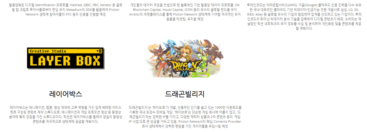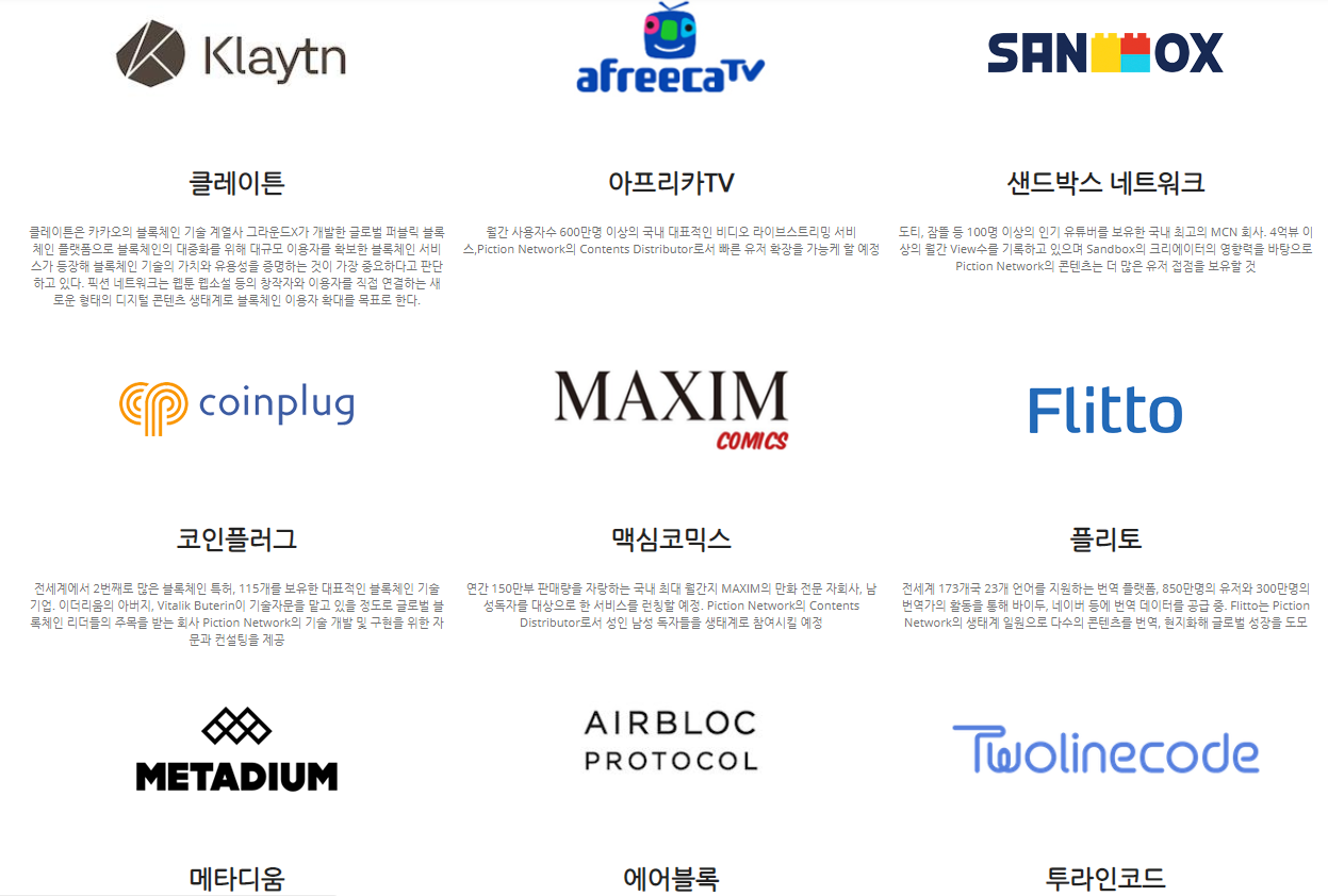 이제 파트너쉽을 보자. 사실 아래 그림을 보고 나면, 모골이 송연해진다. 클레이튼과 아프리카 TV, 샌드박스 네트워크, 맥심코믹스, 플리토 등등. 사실 이 파트너쉽만 놓고 보면 픽션 네트워크가 할 수 있는 일은 디지털 컨텐츠의 거의 모든 것이라 말해도 무방할 것 같다.