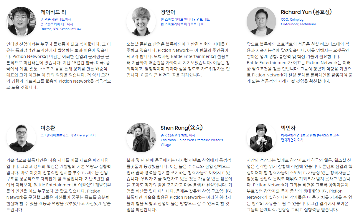 "인터넷 시대의 전통적인 디지털 컨텐츠 사업들(웹툰, 웹소설, 디지털 방송 등)은 블록체인 기술을 통해 재편되려 하고 있다. 그리고 그 흐름을 읽고 있는 종래의 거인들은 픽션 네트워크로 모여들고 있다."