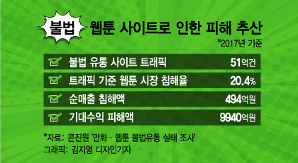 블록체인이 적용될 수 있는 가장 큰 영역 중 하나는 디지털 컨텐츠를 재창조하는 데 있다. 블록체인이 나오기 전엔 인터넷이 전세계를 연결시키는 망이었고, 지리적으로 분리된 사람들을 연결시키는 동시에 그 연결성을 활용해 수많은 혁신적인 사업들을 탄생시켰다. 그런데 이 인터넷 환경에서는 새로운 문제가 생겨났다. 바로 복제의 문제. 인터넷에 올라오는 0과 1로 구성된 모든 디지털 자료들은 아주 쉽게 복제가 가능해졌고, 그에 따라 아주 빠른 유통과 공유가 가능해졌다. 가장 쉽게는 웬툰, 그림, 음원, 게임 등 거의 모든 디지털 자료들이 쉽게 복제될 수 있게 됐다. 물론 유통이 원활해짐에 따라 시장이 확대되는 효과도 있었겠지만, 동시에 창작자의 권리가 침해되고 피해를 보는 경우도 더 많이 생겨났다. 그 단적인 예로서 웹툰의 불법복제 데이터를 다음 이미지를 통해 볼 수 있다.