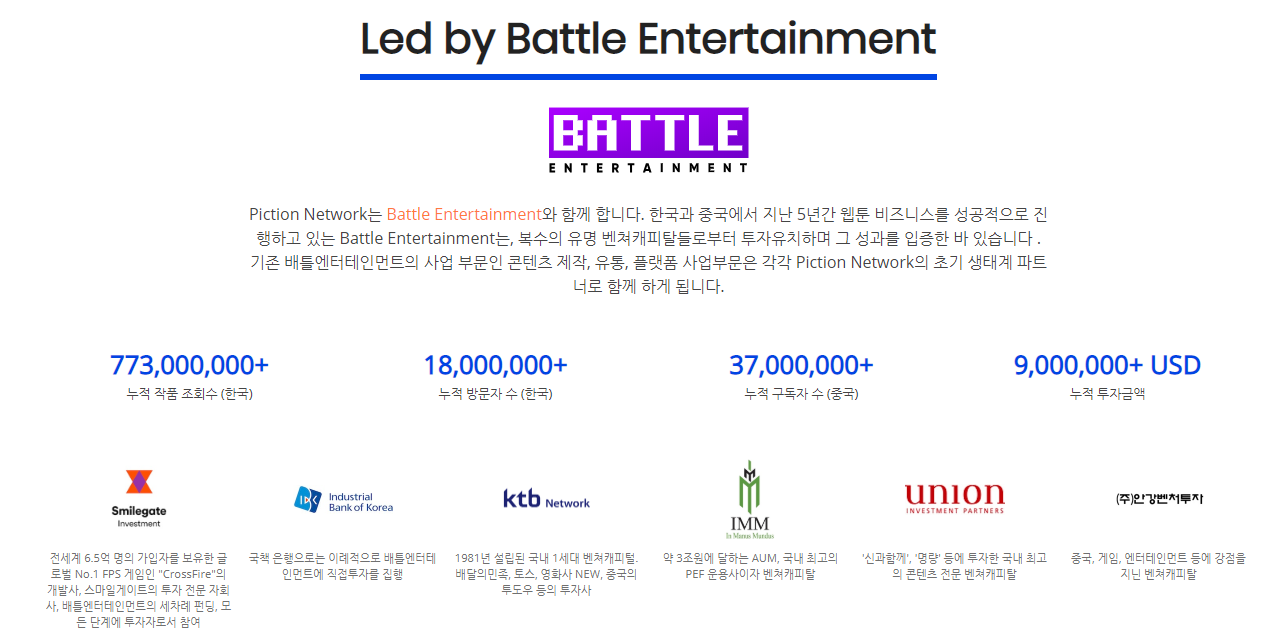 픽션 네트워크는 '배틀 엔터테인먼트'라는 이미 상용화된 자체 사업 기반을 가진 기업이 추진하는 블록체인 프로젝트다. 배틀 엔터테인먼트는 디지털 컨텐츠 플랫폼을 운영하면서 국내외에 해당 컨텐츠를 유통하고 있는데, 가장 유명한 것이 배틀 코믹스라고 하는 웹툰 플랫폼일 것이다. 배틀 코믹스는 2013년부터 한국과 중국을 중심으로 웹툰 및 웹 소설 등의 지적재산을 유통해왔는데, 누적 방문자수는 한국에서 1,800만 명에 이르고 중국에서는 3,700만명에 이르며 한국 내 누적 작품 조회수는 77억회가 넘는다. 그리고 이들은 당연히 블록체인 프로젝트의 조기 확립을 위해 모회사가 보유한 자체적인 역량을 활용하고자 한다. 즉, 콘텐츠 제작과 유통, 그리고 플랫폼 사업 등은 초기 생태계에 핵심적인 역할을 할 수 있을 것이다.