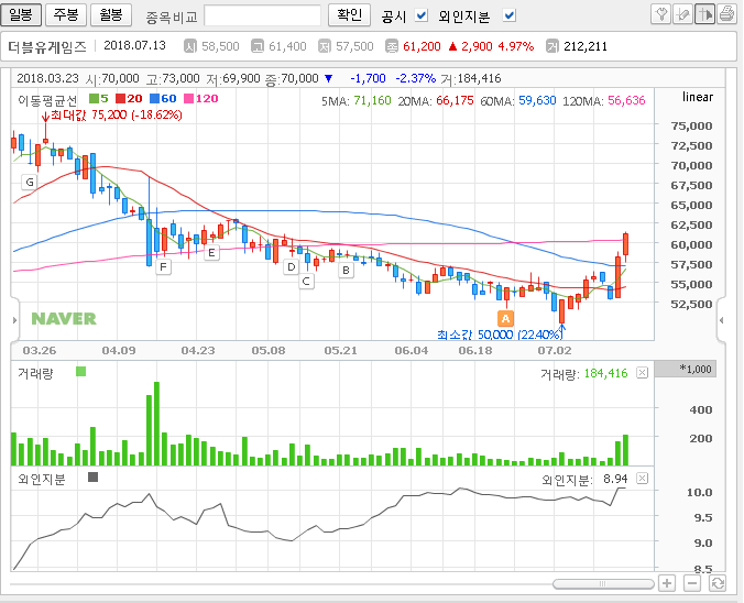 더블유 게임즈가 60일선을 돌파하며 좋은 모습을 보여주고 있다.