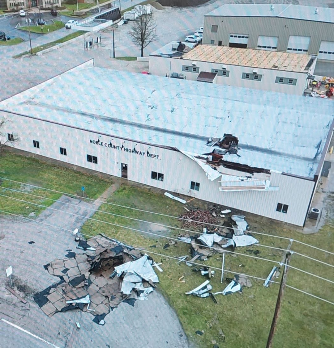The March 30 storm damaged the roofs of two Noble County Highway buildings, less than a mile from our home.