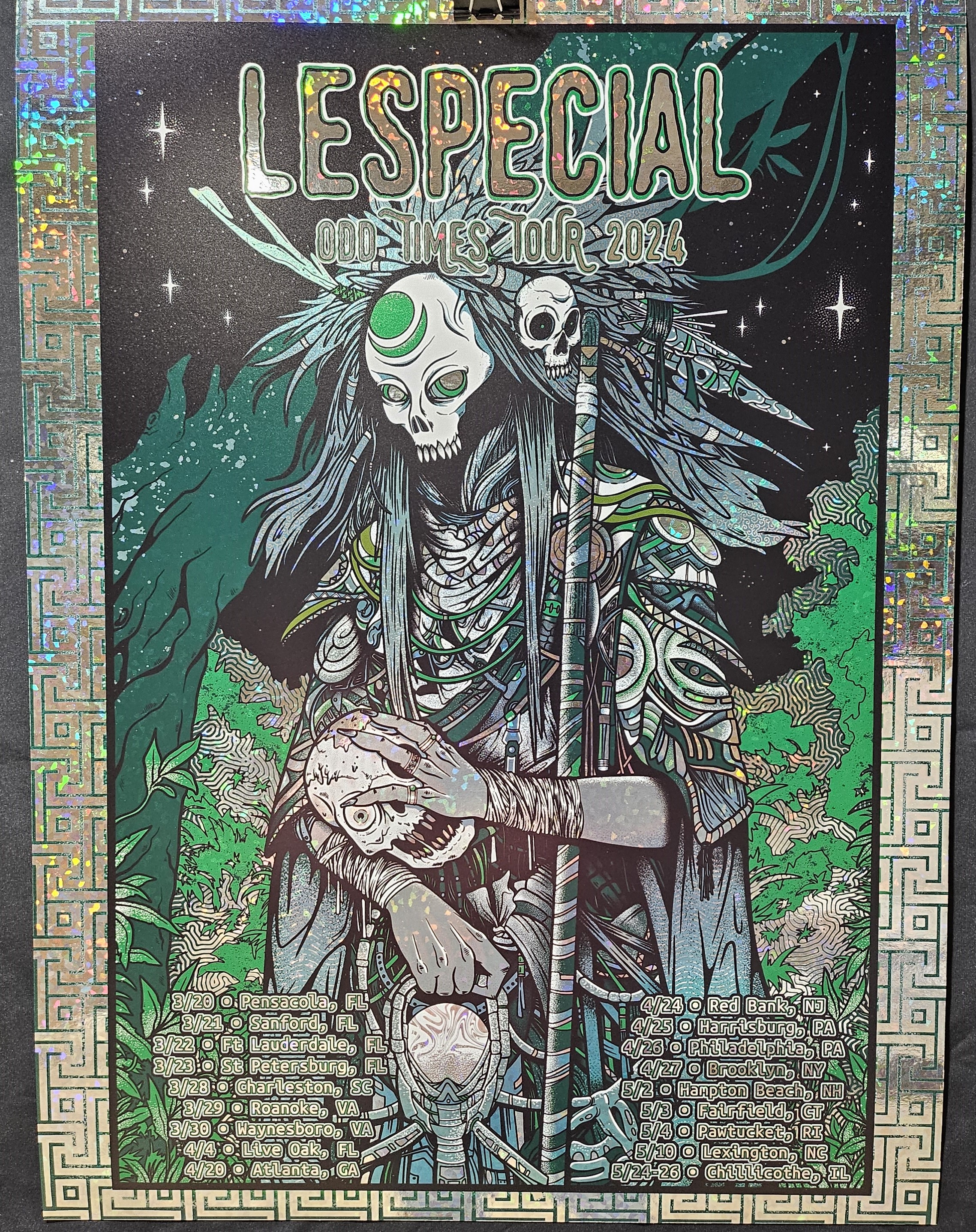 "Cryptic Moss"psyokami (29)in #tourposter • last year Here's a proof from the printer for the variant: "Cryptic Moss" 💚✨ Everything is finalized & scheduled to print ASAP!! 💀💀💀 #OddTimes #tour #poster #print #limited #edition #tourposter #band #merch #darkart #fantasy #art #Lespecial #band #music #shaman #fantasy #oddtimes #tour #poster