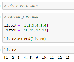 extend() metodu mantık olarak append() metodu ile aynı işlemi yapıyor, bir listeye eleman ekliyor. Ancak append() metodundan farklı olarak bir listeye farklı bir listenin elemanlarını ekliyor.