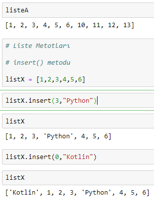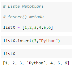 Örneğimizde insert() metodunun en temel kullanımını görüyoruz. insert() metodu iki parametre almaktadır. İlk parametre eklenecek elemanın index değeri, iki parametre ise eklenecek elemanın kendisidir.