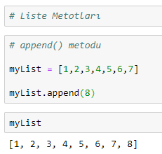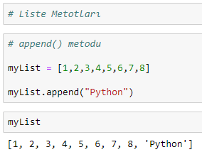 Bu şekilde yaptıktan sonra listeden append() metodunu seçip eklemek istediğimiz elemanı parametre olarak metota verelim. Sonuç olarak eklenecek eleman listemizin sonuna eklenmiş oldu.