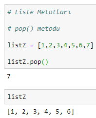 pop() metodu, parametre almadan kullanıldığında listenin son elemanı siler ve bu elemanı ekrana yazdırır. Eğer içerisine parametre alırsa, parametre olarak aldığı index değerindeki elemanı siler ve ekrana basar.