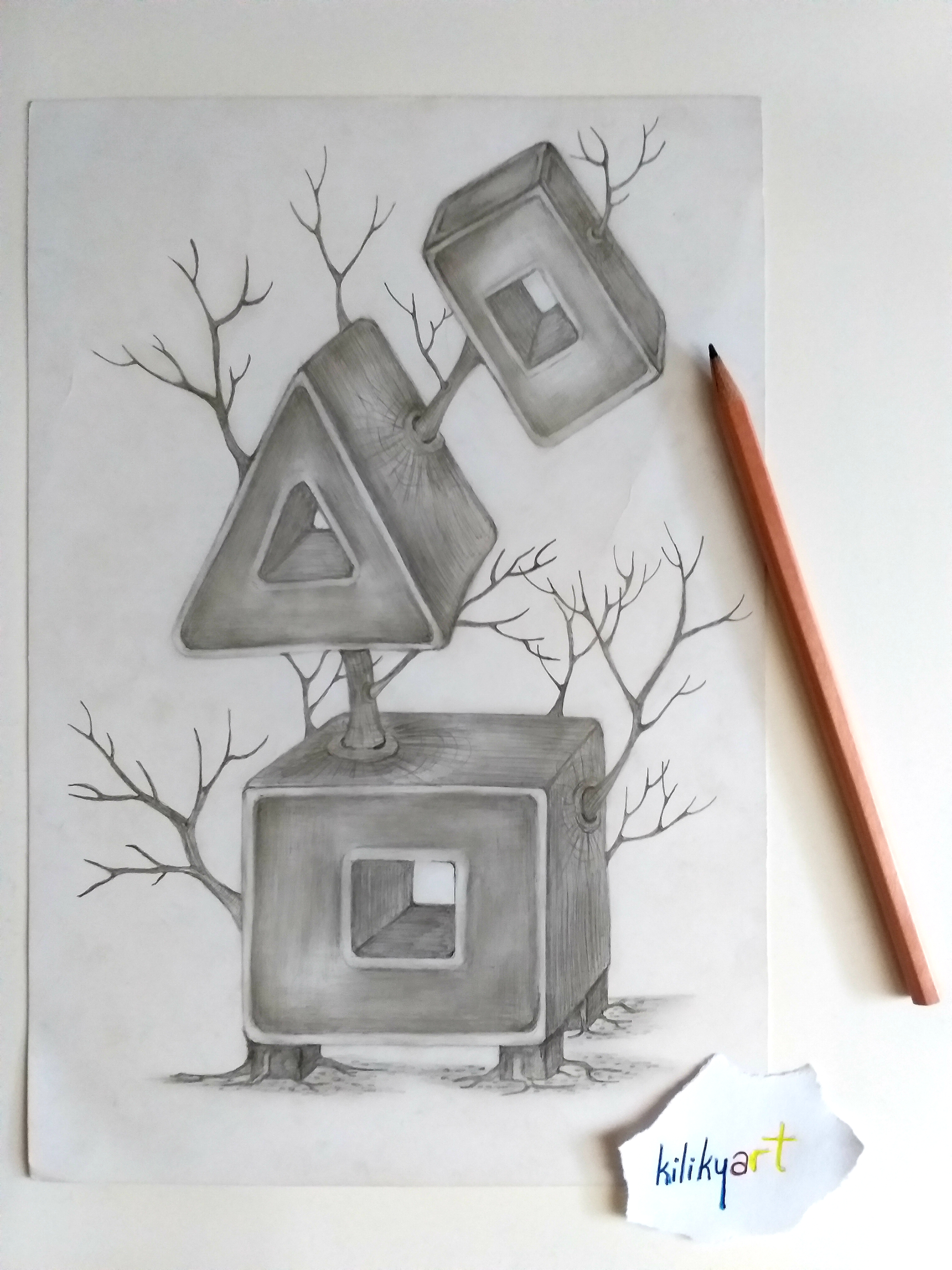Sen bunları kalemle çizmişsin. Evi yıkmışsın ve evi yerinden çıkarmışsın. Bunları kablolarla yapmışsın. Ağaçları da kırmışsın. Kalemle kırmışsın ağaçları. Ve her taraf kar dolu. Çünkü yeşil yok.