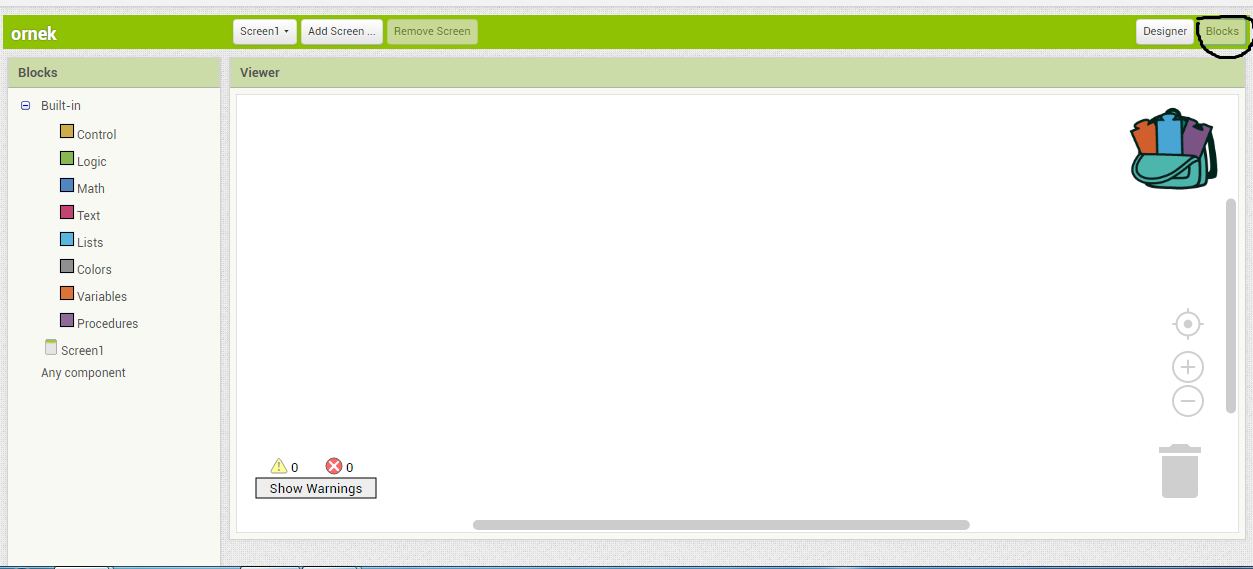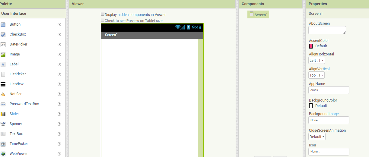 Karşınıza gelen ilk kısım designer kısmı da arkadaşlar burada yapacağınız uygulamanın dizayn işlerini hallediyorsunuz.