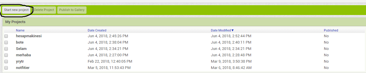 Ekrana gelen ilk sayfada daha önce yapmış olduğunuz projeleriniz varsa onları göreceksiniz.Yukarıdan Start diyoruz ve yapacagımız uygulamanın adını yazarak panele giriş yapıyoruz.