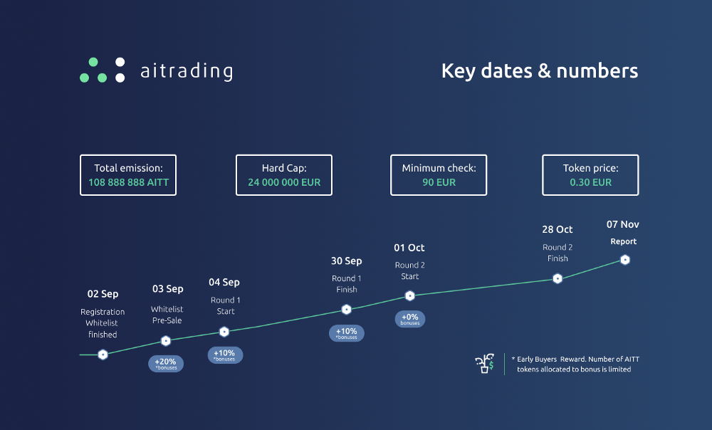 All the key figures of the project are the same, but we have decided to reduce the hardcap. The good news is that we need fewer resources and funds to finalize the MVP keeping in mind that some features are implemented by our partners. Our ML team is gaining good pace in development of AITrading’s core functionality. However, they need a bit more time to make it all user-friendly and convenient.