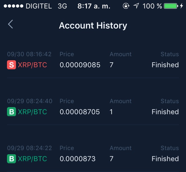 Tengo tiempo mirando el Ripple, he notado que cada vez que el BTC baja, el Ripple sube un poco. Aquí dejo una captura de mi operación, estoy utilizando un Exchange muy bueno que maneja grandes volúmenes de mercado a diario.