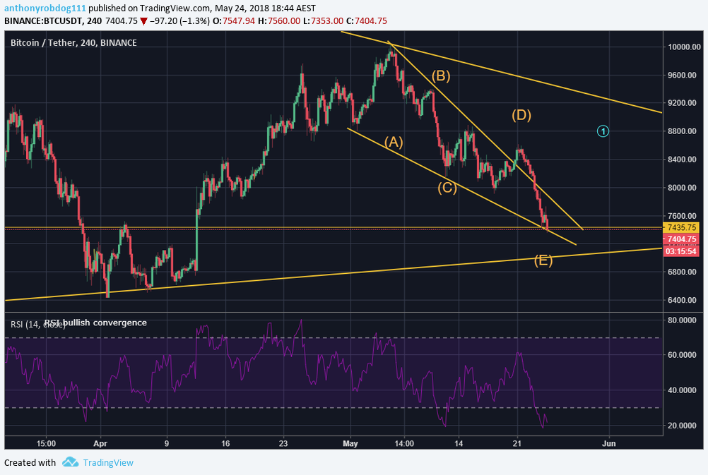 The ABCDE correction is almost complete, we are at the bottom of the wedge and on strong support levels of 7.4K. There is still potential for it to go down further, but likely not below the sloped trend line.