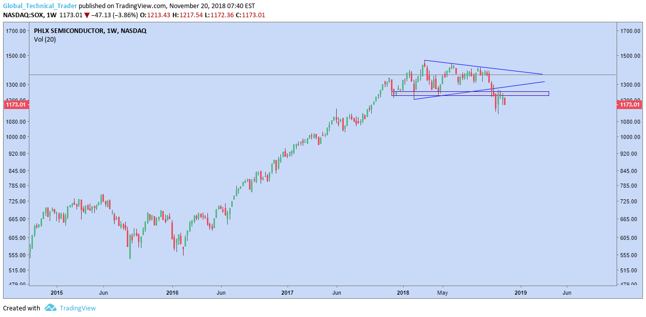 After spending almost the last two years consolidating in an inverted triangle with support tested 8 times along the way, price has finally broken down. This is occurring as the Semi's are rejecting the retrace to the resistance of the major topping pattern that it recently completed, as shown below.
