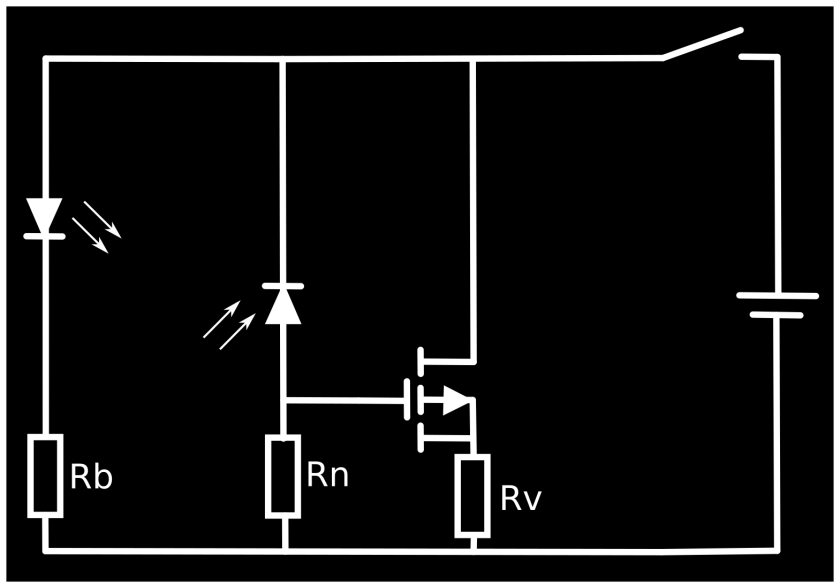 In Idle state, the light, emitted by the LED is being catched by the photo diode (can also be a photo transistor if necessary), so a high current flows through the photo diode and the resistor Rn. This results in a positive gate-source voltage of the p-chanel MOSFET, so it locks the current flow through the consumer Rv. For reducing enegy loss, the resistance Rn should be as high as possible. In triggered state, nearly no current flows through the photo diode, so the gate-source voltage of the MOSFET is negative, so the MOSFET will turn on and let the current flow through the consumer Rv. The resistance Rb is just a base resistance for protecting the LED from overvoltage.