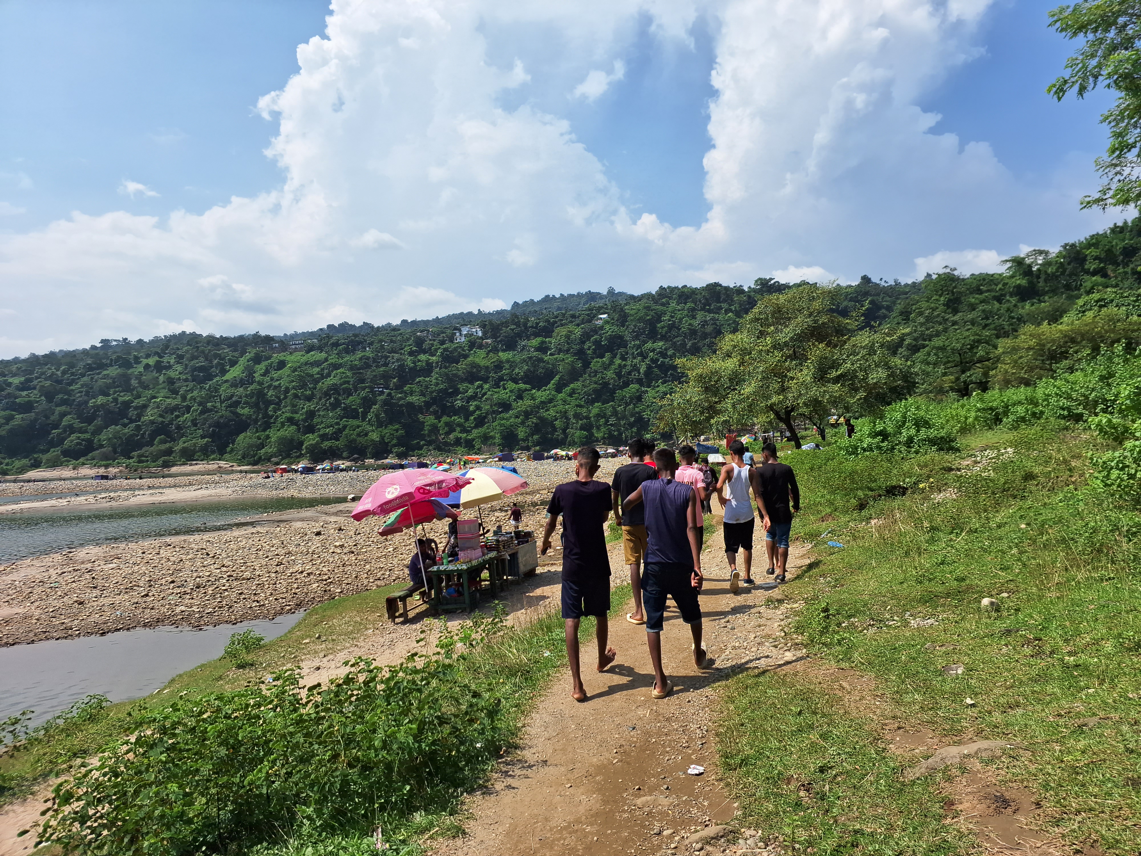 আমরা জাফলং যার উদ্দেশ্যে যখন রওনা দিয়েছিলাম তখন ঘড়ির কাঁটায় ১ টা বেজে ৩৩ মিনিট ছিলো। দুপুরের প্রচন্ড রোদ মাথার উপরে এসে পড়েছিল। আমাদেরকে এখন প্রায়ই আধা ঘণ্টার মতো হাঁটতে হবে প্রথমে সিঁড়ি দিয়ে তারপর বালি আর পাথরের ভেতর দিয়ে।