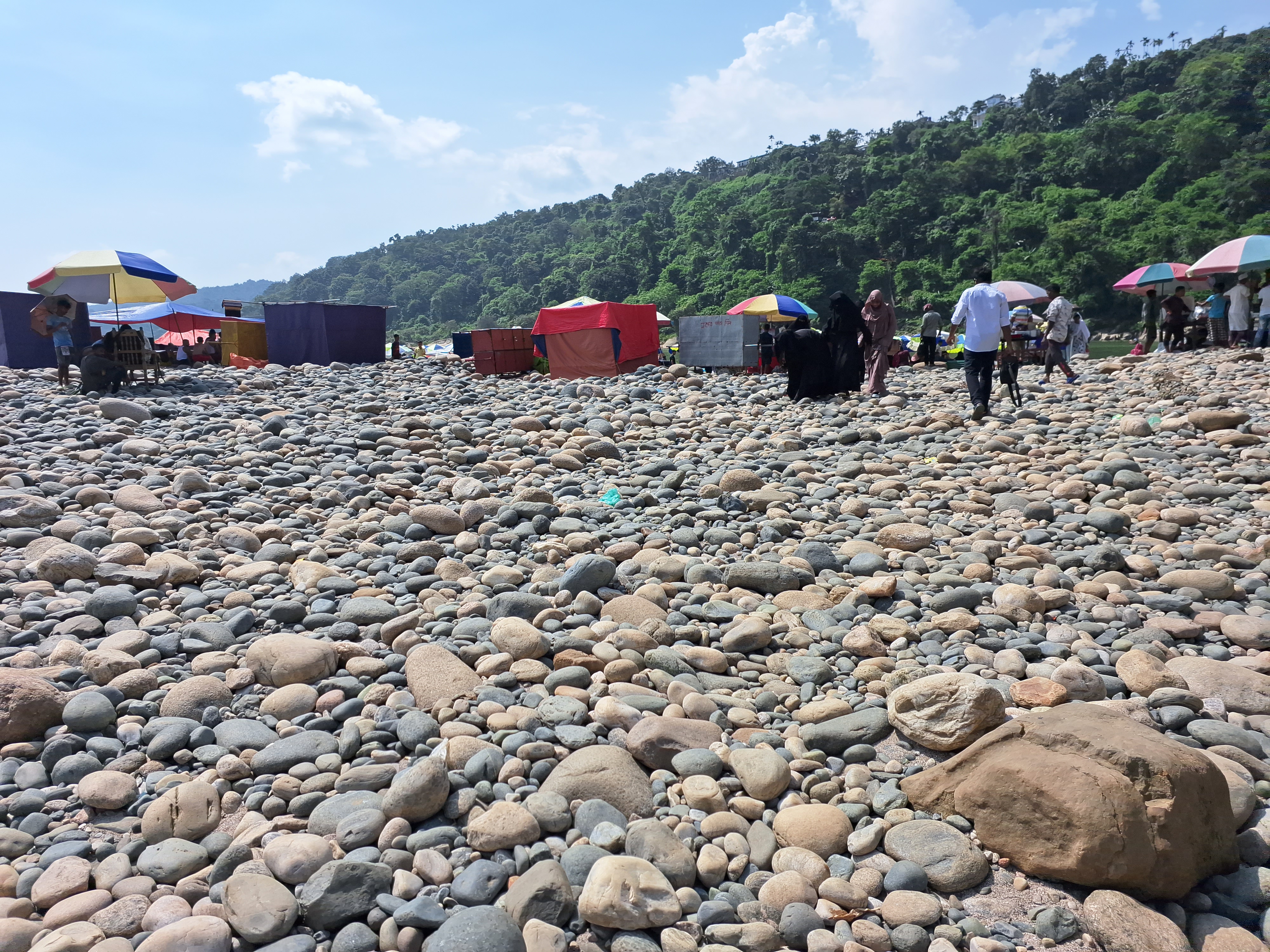 আমরা প্রচন্ড রোদ্রের ভেতর শুকনো নদী দিয়ে হেঁটে হেঁটে জাফলং জিরো পয়েন্টের দিকে আগাতে থাকলাম। সেদিন রোদের তীব্রতা এতটাই বেশি ছিল যে, হাঁটতে হাঁটতে হাঁপিয়ে যাচ্ছিলাম। তবে চলার পথে মাঝে মাঝে গাছের ছায়ায় দাঁড়িয়ে রেস্ট নিয়েছিলাম।