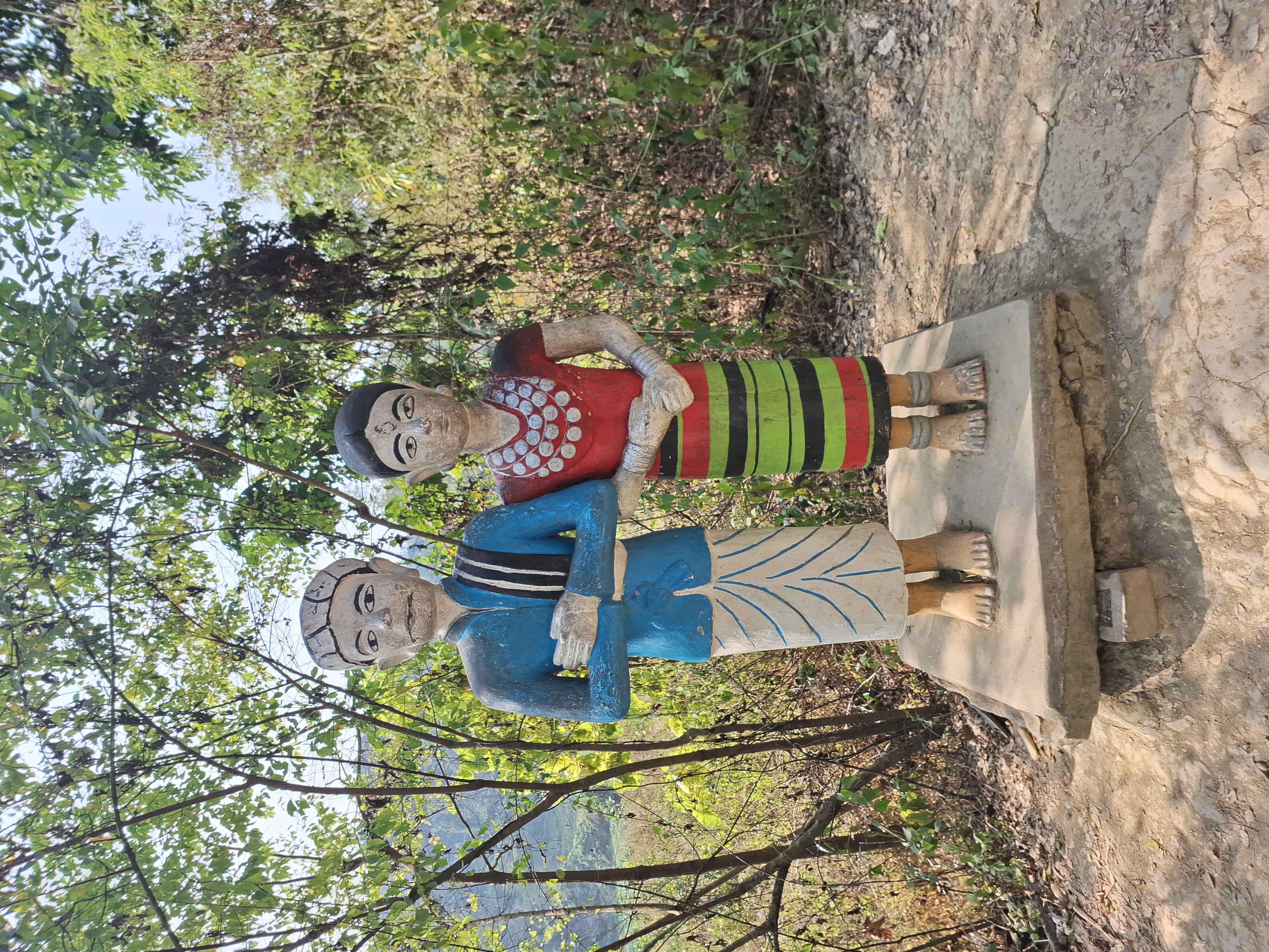আর এই জায়গাটা চারপাশে ছিল বড় বড় গাছ। আমরা যেহেতু আজকে তিনটি স্থানে ভ্রমণ করব তাই এখানে বসে অতিরিক্ত সময় ব্যয় না করে পরিবেশটা যত তাড়াতাড়ি পারা যায় উপভোগ করার চেষ্টা করেছিলাম। যাইহোক আমরা এখান থেকে একটু হাঁটতে হাটতে সামনের দিকে যেতে থাকলাম। একটু সামনে যেতে চোখে পড়ল রাস্তার ধারে পাহাড়ি বর আর বউয়ের ভাস্কর্য তৈরি করা রয়েছে।