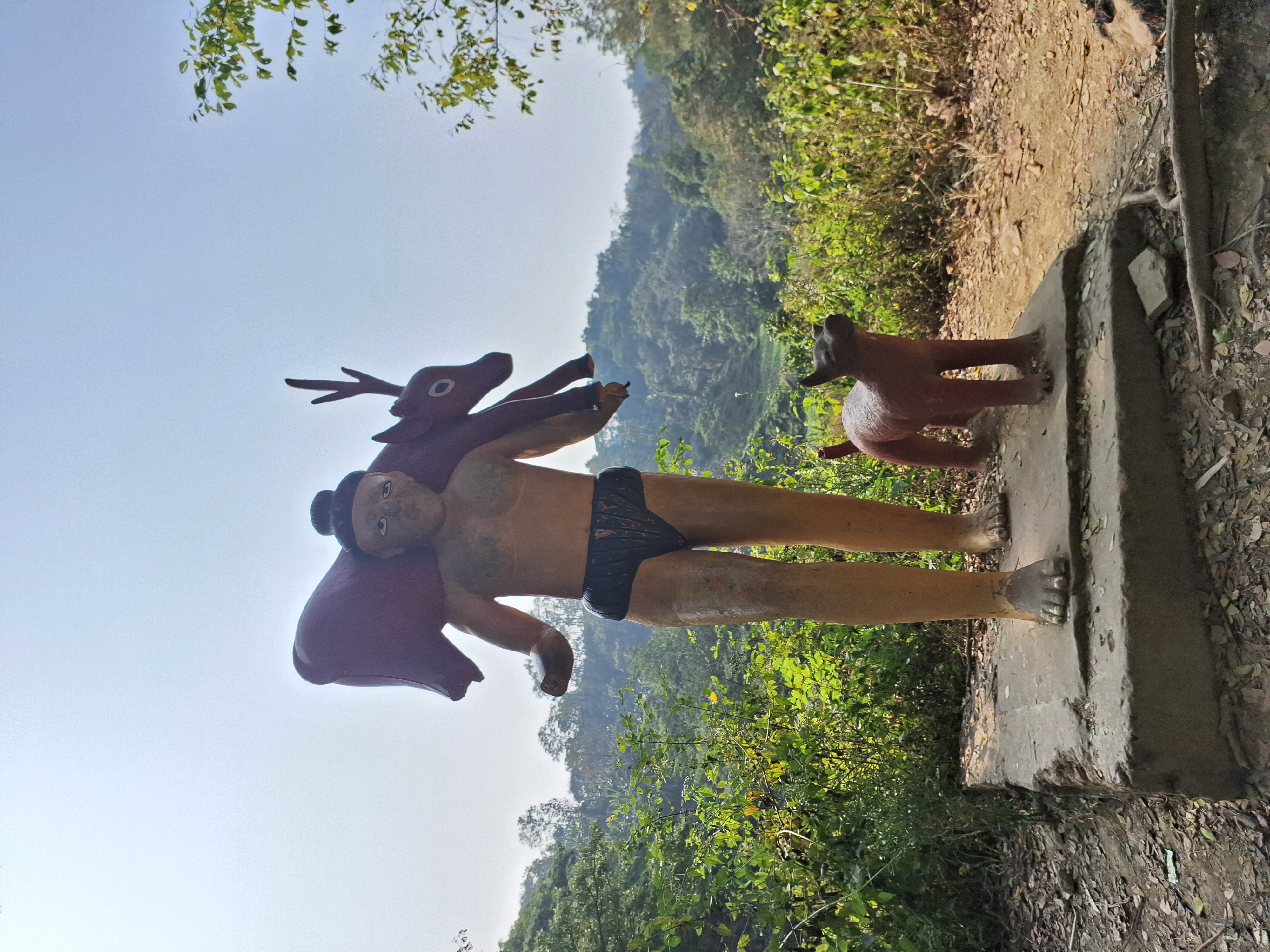 তারপর আরেকটু আগাতেই দেখি আরো একটি ভাস্কর্য তৈরি করা রয়েছে। একটা পাহাড়ি ছেলে হরিণ কাঁধে করে নিয়ে যাচ্ছে আর পাশে কুকুর রয়েছে। এই দুইটি সুন্দর সুন্দর ভাস্কর্য দেখে বেশ ভালই লাগলো। এসব ভাস্কর্য গুলো অনেক পুরনো সিমেন্ট বালি এবং রড দিয়ে তৈরি করা। আমরা যেহেতু দুপুরের দিকে মেঘলা পর্যটন কেন্দ্র ভ্রমণ করতে গিয়েছিলাম তাই তখন বেশ ভালই রোদ ছিল।