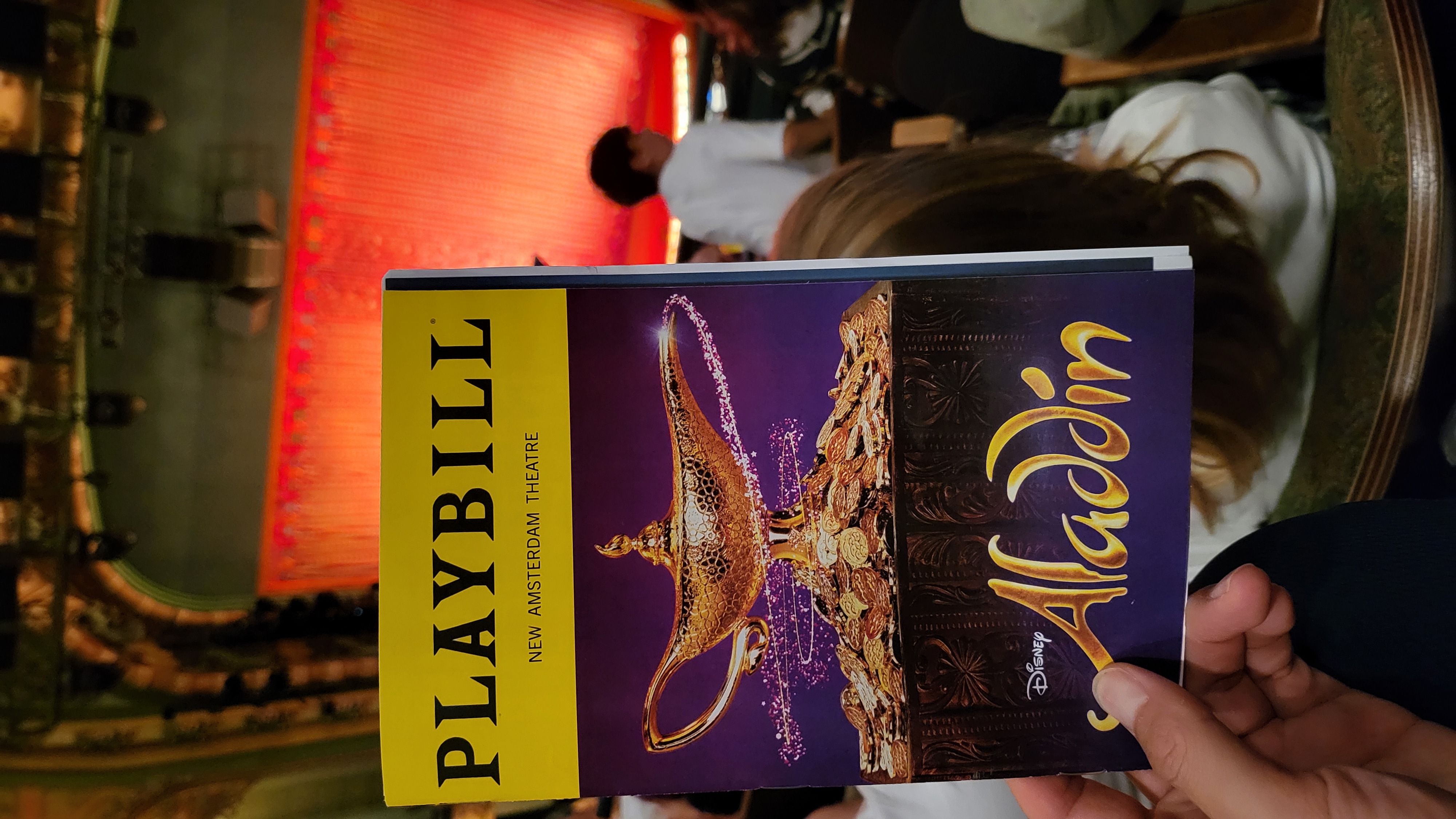 7시에 예약한 뮤지컬 '알라딘'을 보기 위해 6시10분에 숙소에서 나왔다. 숙소에서 멀지 않은 곳이라서 공연극장까지 걸어갔다. 이제 타임스퀘어는 내 집 앞마당같이 익숙하다. 발코니(3층)에 앉았다. 아이들이 공연장 안에 들어와서 보고는 극장의 웅장한 모습에 조금 긴장한 모습. 너무 기대된다. 알라딘. 라이온 킹보다 재미있을까. 지니가 램프에서 나오는 모습은 어떻게 표현할까. 날으는 양탄자는 어떻게 표현할까.