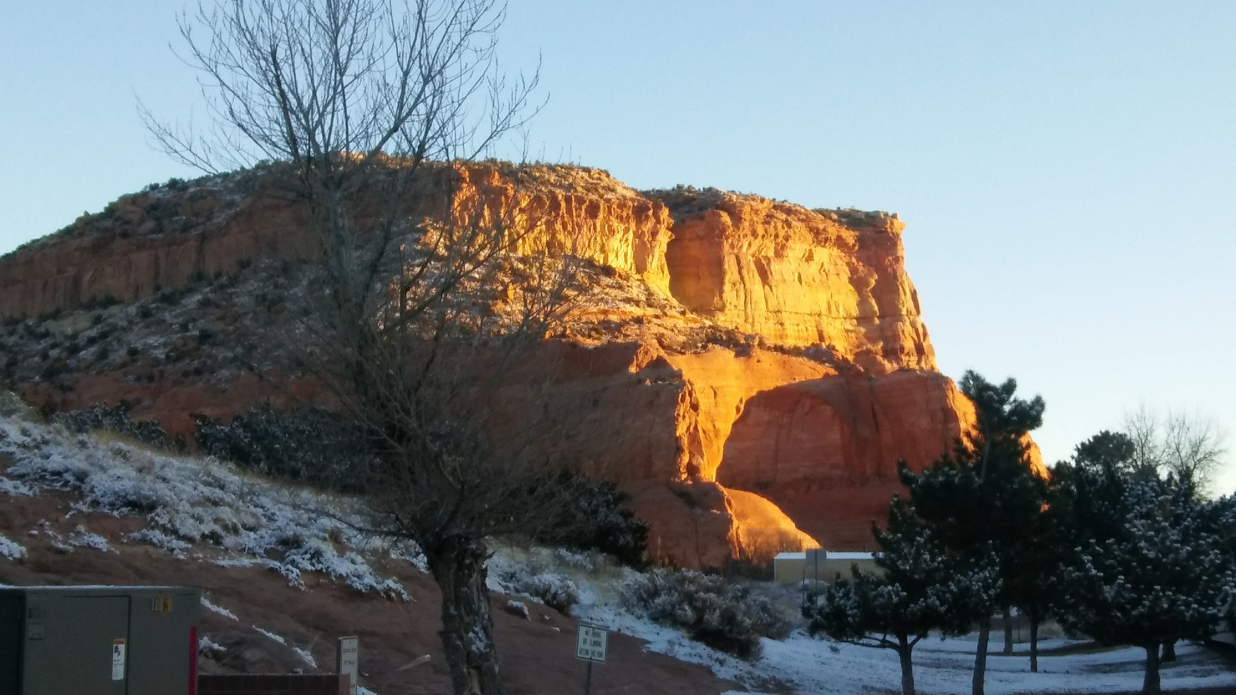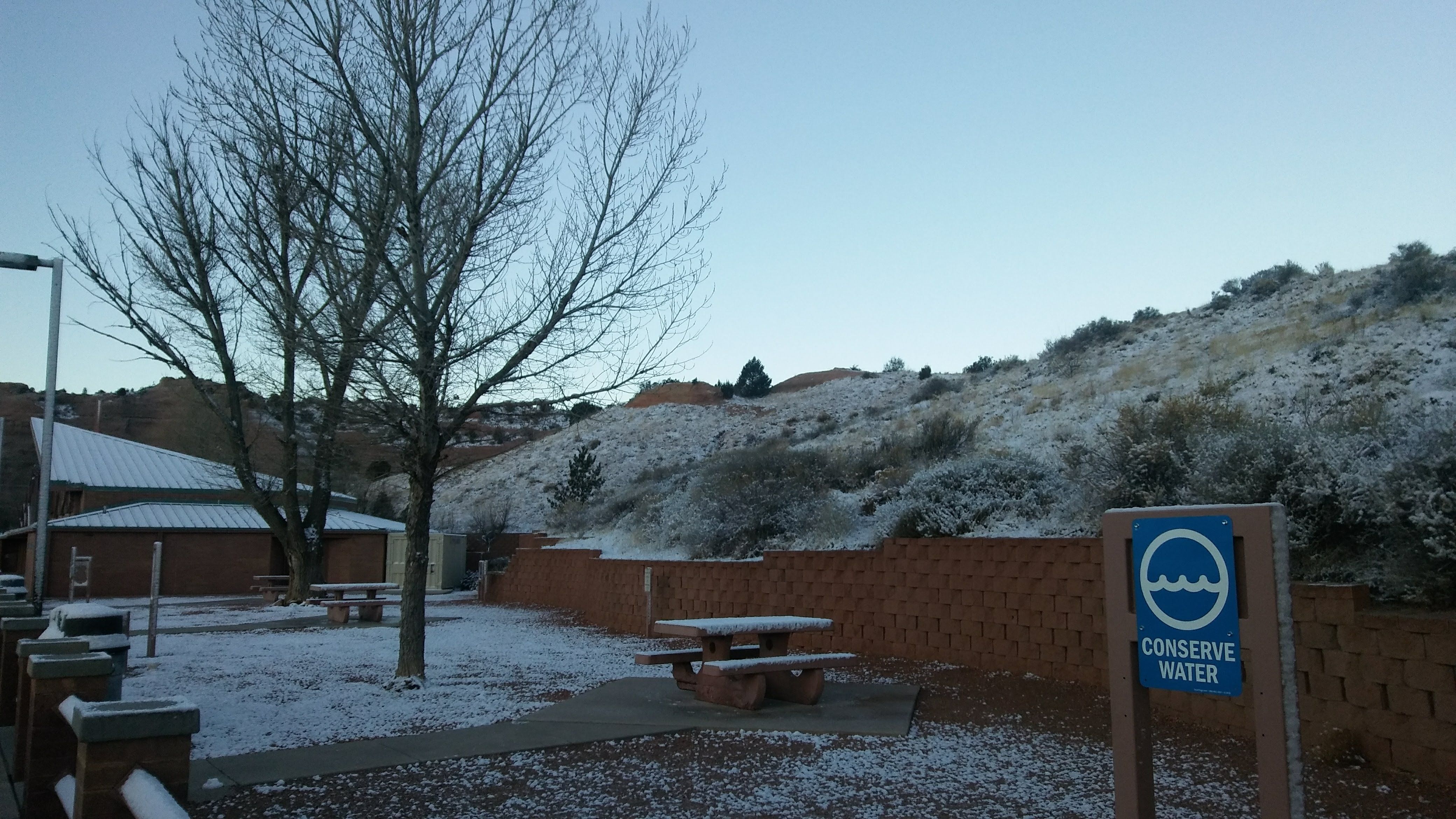 We stopped overnight at a rest area just inside the Arizona border. It was dark and windy and a little chilly but nothing bad. We got arranged and climbed under the blankets, only to wake up to this: