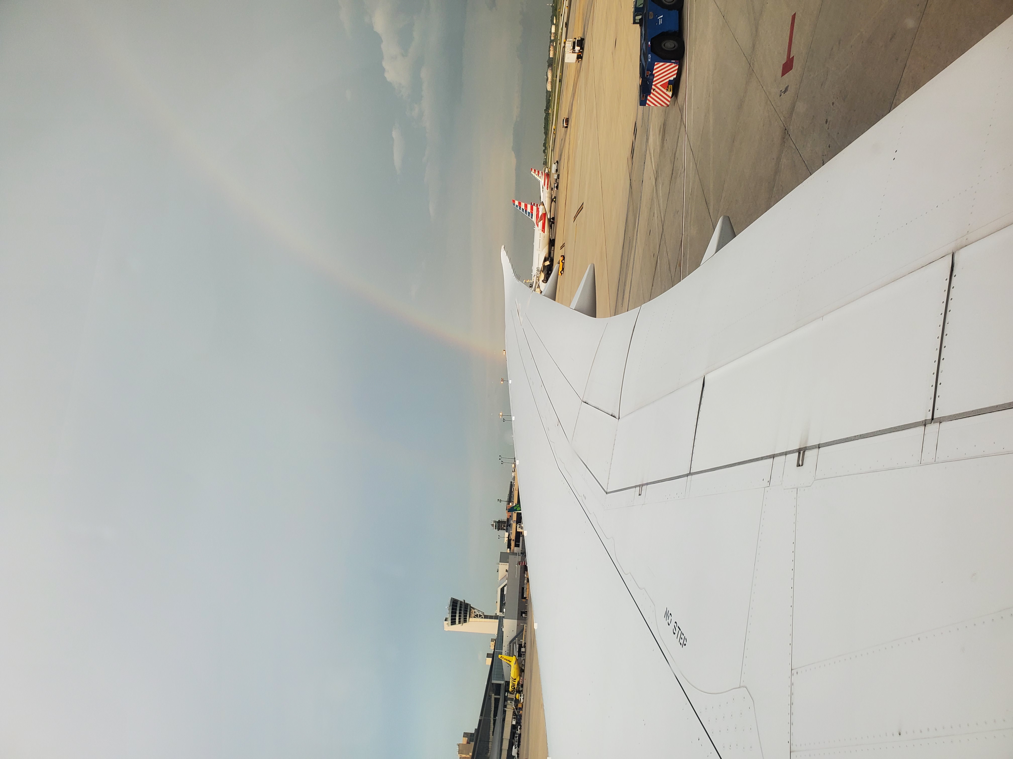 Right before the takeoff began, I looked out to my right, and saw such a splendid sight: a rainbow almost perfectly formed in line with the wing of the plane. Never have I leapt to take a picture as fast as in that moment. The picture was pretty good, but did not do the scene justice. This moment was created to be enjoyed, and made me reflect on the majesty of God's creation.