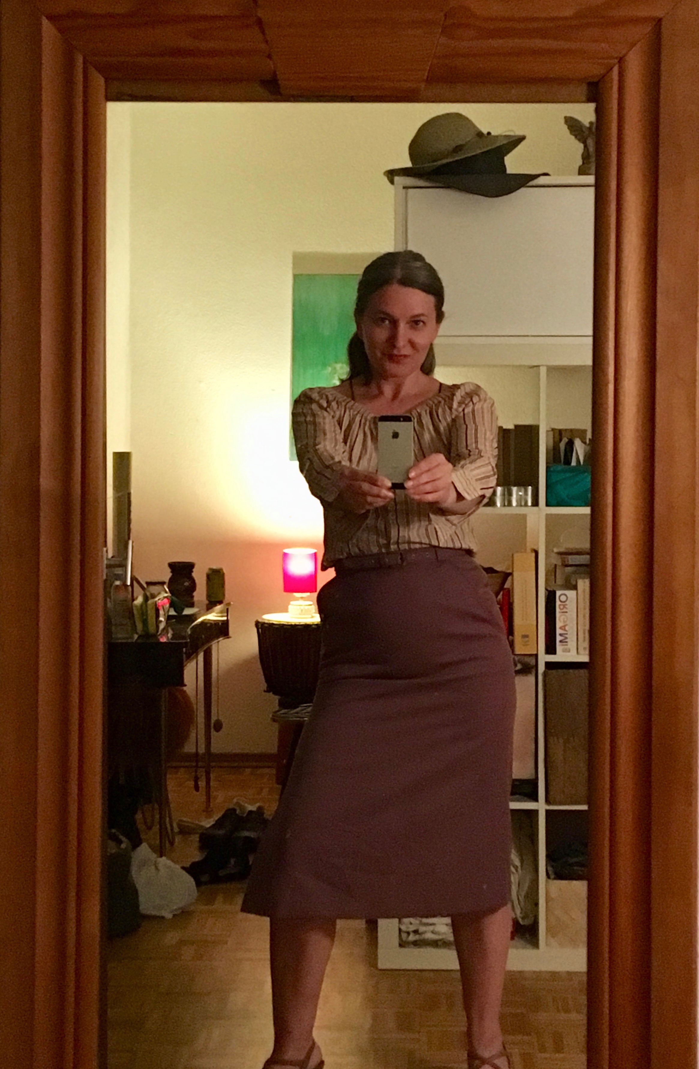 right: back home - pencil skirt - maybe from the 50s (?) and blouse in matching color stripes which I bought decades ago and never found a combination to wear with!