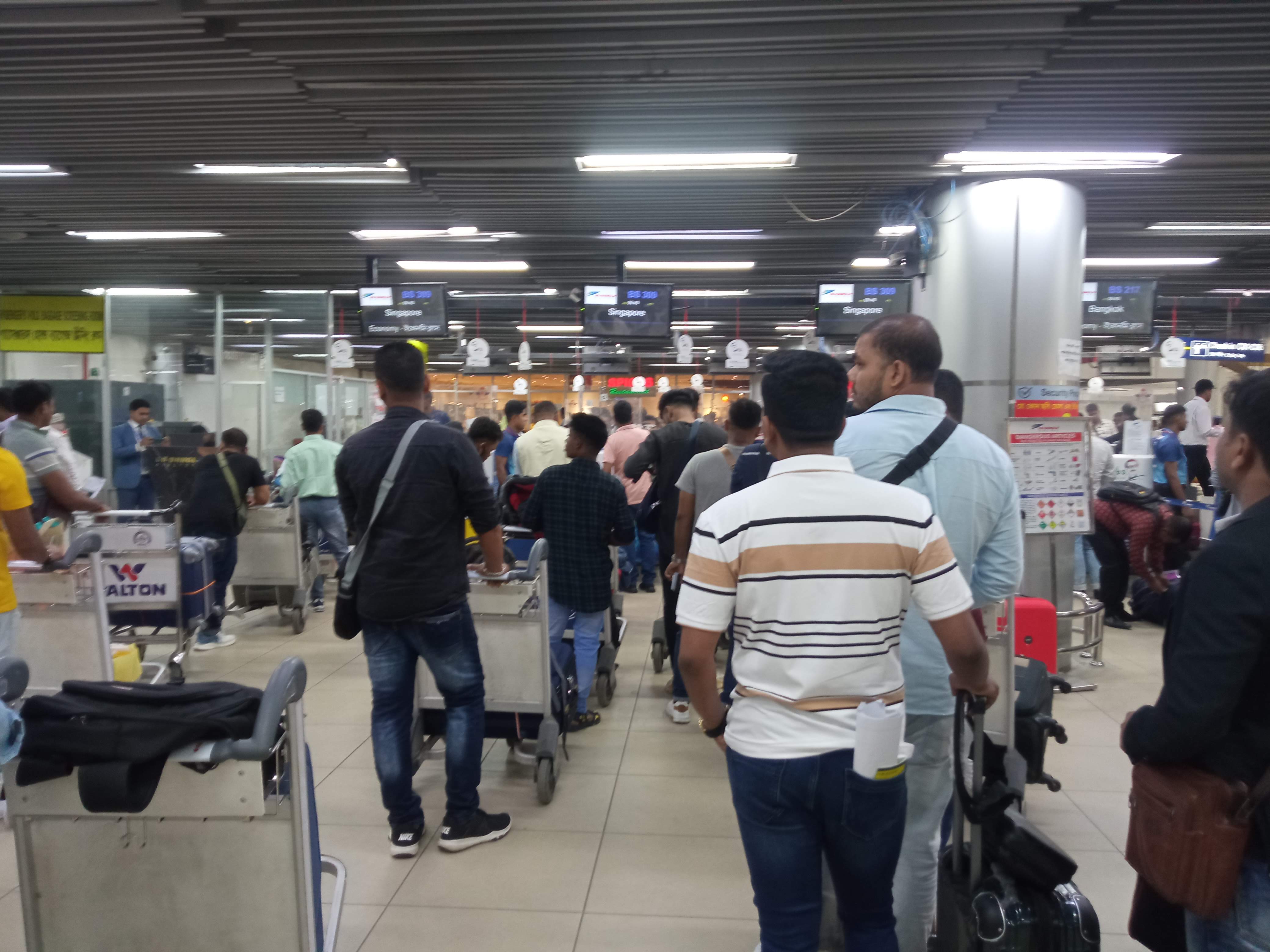 আমাদের টিকেটের গায়ে লিখা ছিলো ৭টা ১৫ মিনিটে ইমিগ্রেশনে থাকতে হবে, আমরা ৭টা বাজার পূর্বেই বিমানবন্দর চলে আসি এবং তারপর নতুন এক অভিজ্ঞতা অর্জন করি, কেন আমাদের তিন ঘন্টা পূর্বে বিমানবন্দর আসতে বলা হয়েছিলো? বিমান বন্দরের প্রথম গেইট পার হতেই আমাদের ৩০ মিনিট চলে যায়, অথচ এখানে কোন সময় লাগার কথা ছিলো না, পাশের জনতো আরো ভয় ধরিয়ে দিয়েছিলেন, উনি নাকি দুই ঘন্টা যাবত সেখানে দাঁড়িয়েছিলেন, ভেতরে টুকতেই পারছেন না। হঠাৎ এক ভদ্রলোক এসে বললেন ভিতরে যাবেন, সিরিয়াল ছাড়া ব্যবস্থা করে দিবো, জিজ্ঞেস করলাম কত টাকা লাগবে উনি বললেন দুই জনের ১০০০ টাকা লাগবে, বুঝেন এবার কেন সকলের এতো সময় লাগতেছিলো এখানে? অথচ এখানে কোন চেকিং নেই, কোন কিছু দেখার নেই এবং বলারও নেই। এটা ছিলো মূল গেইট, এরপর ভিতরে গিয়ে যার যার কাংখিত বিমানের কাউন্টারে যাবে এবং বোডিং পাস নিয়ে ইমিগ্রেশনের সিরিয়ালে দাঁড়াবে। কিন্তু যারা নতুন বিষয়টি জানেন না, তারা হয়তো ভয়ে ৫০০/১০০০ টাকা ঠিক দালালদের দিয়ে ভেতরে ঢুকতে বাধ্য হবেন।